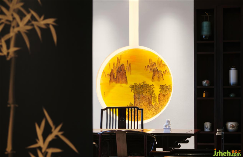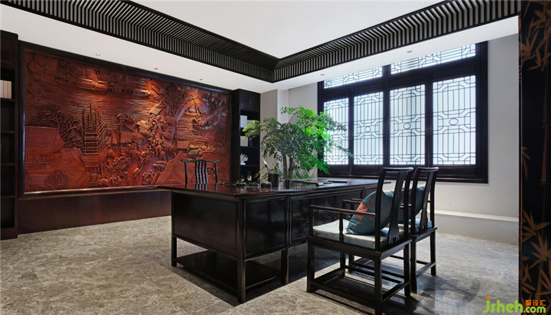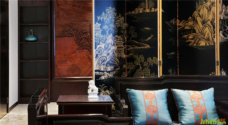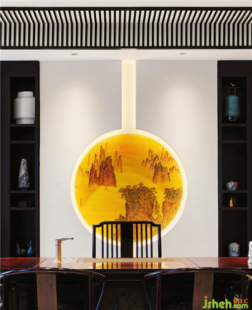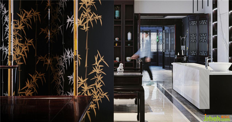 三进营造接待和办公的区域,通过扬州漆器屏风让这两个区域隔而不断。接待区除了沙发,还根据使用者个人的喜好,设置了个人的喝茶品酒区,南京会所设计为了空间风格上的融合,用了同红木色的柜体。而办公区背景设计的是红木雕,即《清明上河图》中最热闹的一段画面场景,不用爆品背景装饰。