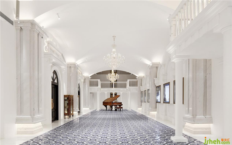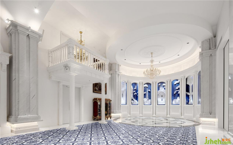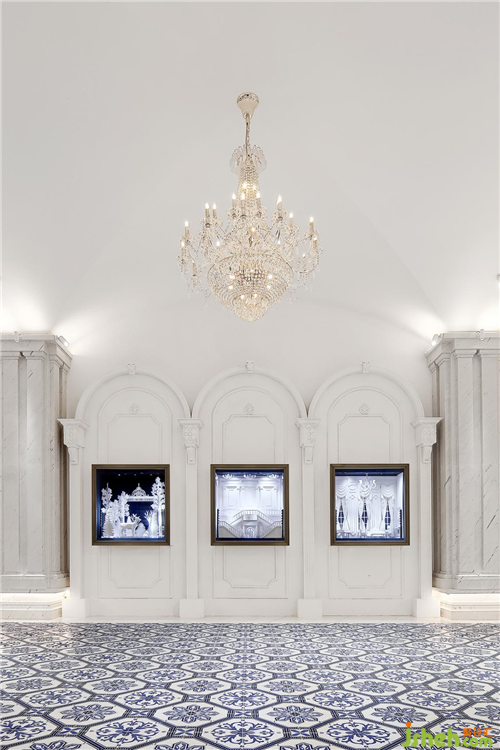 青花瓷与欧洲是有着悠久的历史渊源的,作为元代横空出世的旷世瓷器,本身它就是一件完美的中西方融合的产物,元人西征,南京展厅设计用中国瓷器的制造工艺,及中欧特有的苏麻尼青料,创造了青花瓷特有的蓝色,所以自此青花在而后的明清时期不仅成为历代达官贵族追捧的收藏件,同时又通过古丝绸之路成为了欧洲的宠儿,在欧洲古典绘画中常会出现青花瓷的身影,所以色调上整个艺术廊把青花的苏麻离青料特有的青灰色地砖作为地面,而这也成为了空间中唯一硬装基础上可见的颜色。