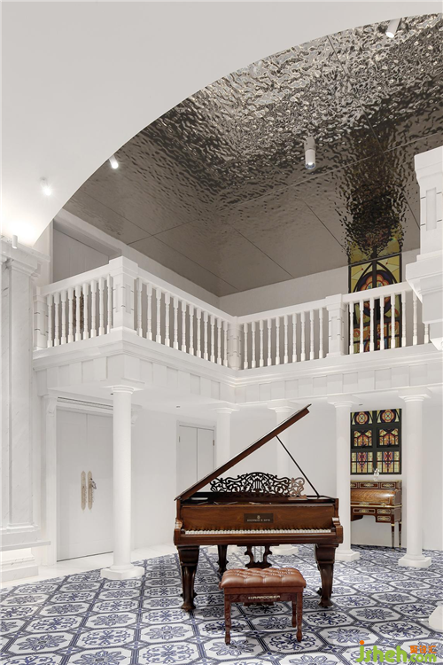 不锈钢是相对现代风格中常用的一种材质,在艺术廊中,我们用这个材质最主要的原因是这个廊桥的下部会有一架正好生产于1865年的“施坦威”古董钢琴,不锈钢的镜面反射效果,会让这部钢琴在顶部有一定投射,同时水波纹的肌理,会让这种投射变得相对模糊,也就是廊桥上的人、廊桥下的琴、与顶部映射的影像,三者之间会相对形成空间中比较有趣味性的画面。