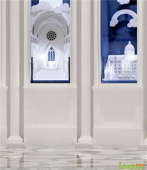 所有的橱窗,则是以纸艺的形式重现了很多个法国的经典建筑场景,也就是以纸的软性和空间的刚性形成对比,同时微缩的场景空间,为各类宝石提供有趣味性的展示背景。