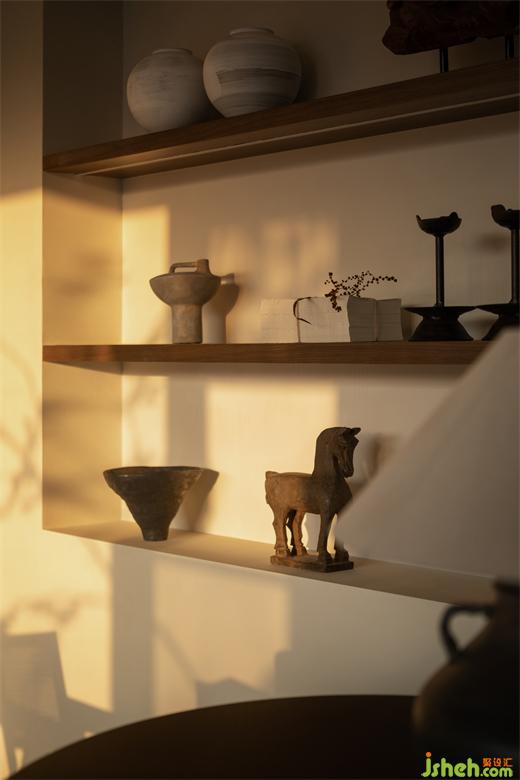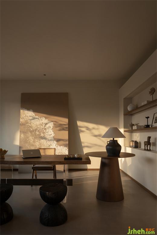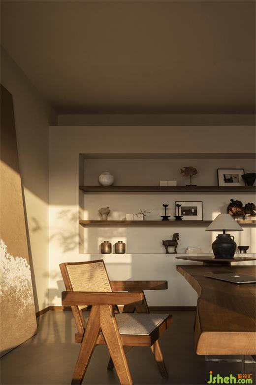 历史留下沉积,阳光永恒不变。得益于光影的配合,风景也跟随人的脚步向室内延展,生发令人心生向往的松弛感。一张随性的长桌茶台、具有生活包浆感的老木件、落地斜倚的大画,是空间慵懒的自语。民宿设计师特意在一层主楼建筑上方增加了长长的格栅屋檐,一直贯通到餐厅连廊,既可遮风挡雨,又能徜徉在自然的风中。拿个蒲团落坐于此,发呆,看书,聊天,坐看光影在墙面、地上攀爬嬉戏,山里的风吹过门廊,格外轻松。