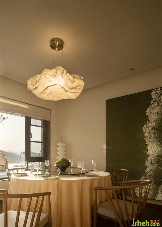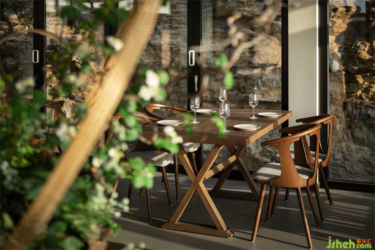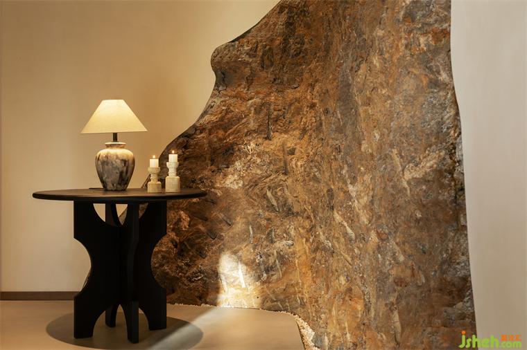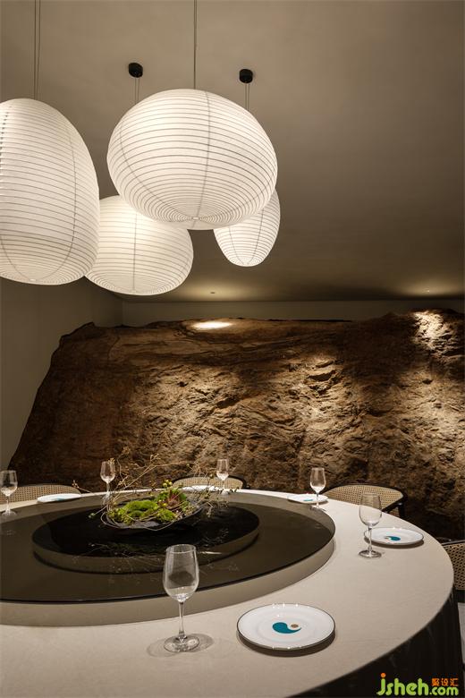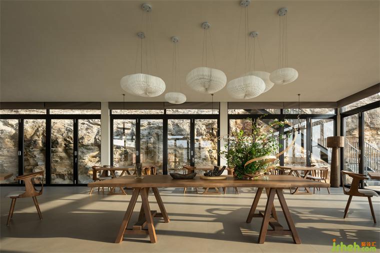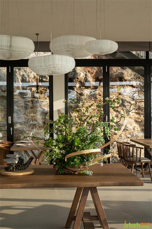 山野的真实,来自山体渗透着的水气,灯光略过熠熠生辉。这一刻,粗粝质朴和精致现代在一个空间中重叠交错。在这里吃饭,最是安心,有“靠山”在,还有什么好怕的呢?