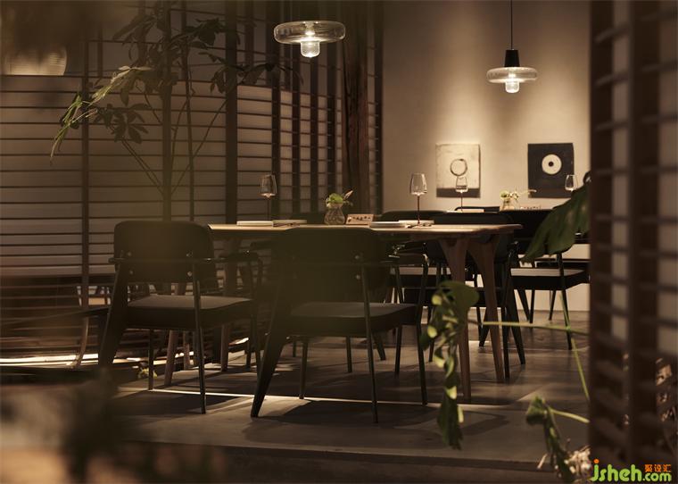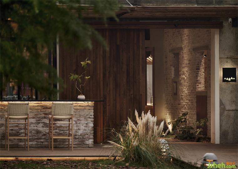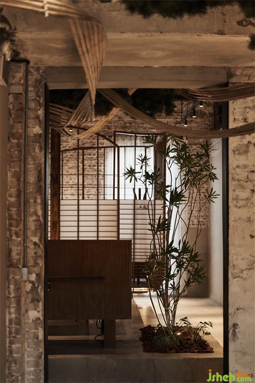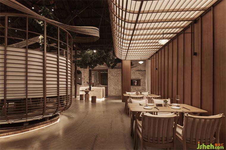 设计师利用松枝与竹编巧妙交织于木梁之下,在视觉上削弱了旧厂房过于高耸的空间感。餐厅局部做地台,从形式上划分不同功能区域的同时保留了空间的整体性,地台上采用树洞形态的装置作为半开放包间,不仅与室外自然环境呼应共生更是进一步营造空间的纵深与层次之美。