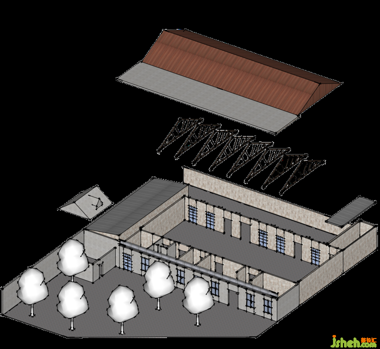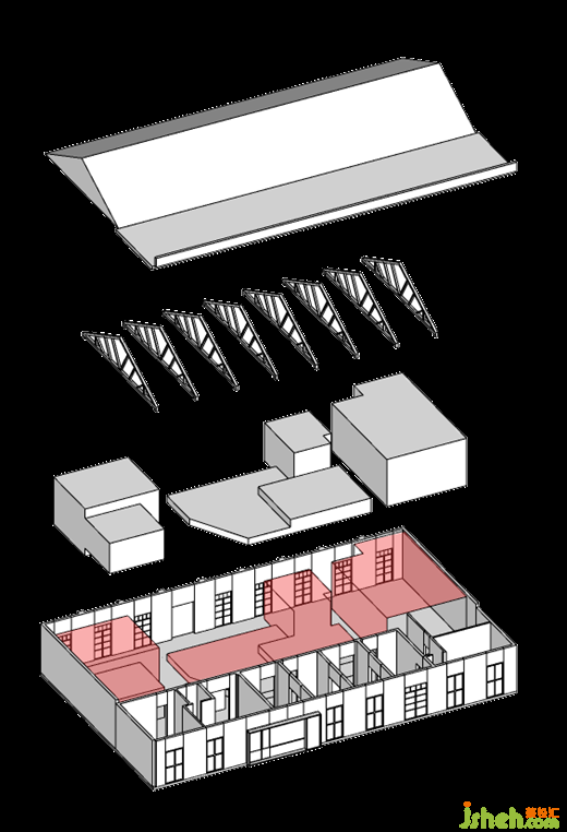 旧厂房室内空间主要由中央操作区与前侧办公区两个大空间组成,简单规整的几何空间有利于根据需求进行灵活分割。