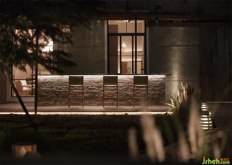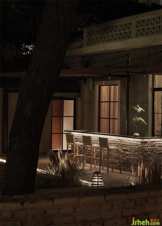 矮红砖墙的设计增强了庭院的围合感,使整个空间更具包容性。此外,设计师用松树皮作为餐厅院子的铺装材料,其天然的质感和颜色随着日夜变迁不断创造着自然之美。