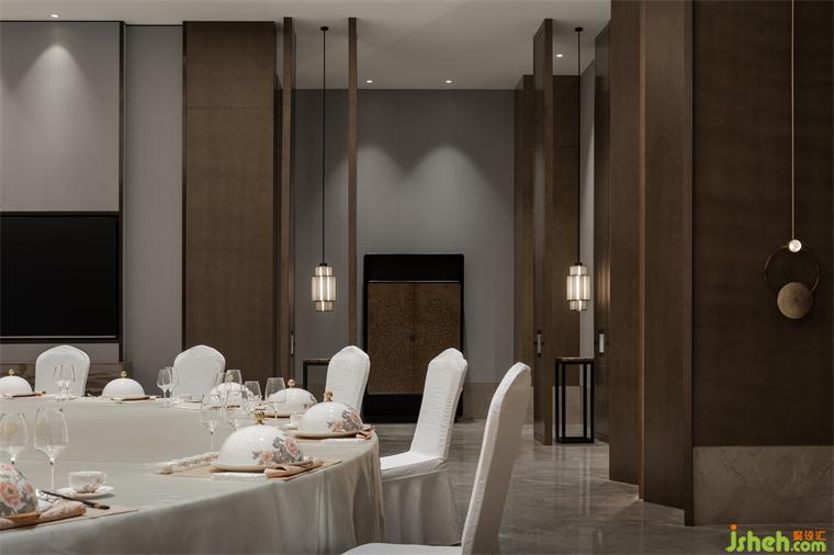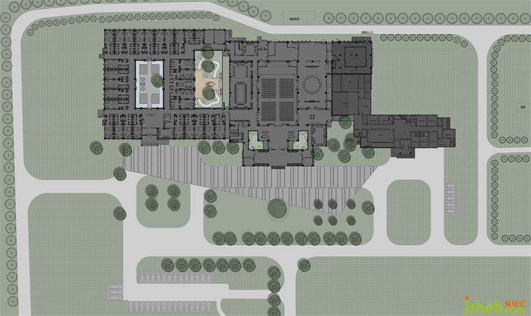 除内部空间,3号楼外侧的广场也是对构建布局、整合功能的重要一笔。非对称式的斜切广场造型更具现代化,规避了园区南北道路对3号楼建筑的冲击,同时也是对其外围零散地块进行有序整合,将东侧2号楼有机纳入3号楼的整体布局中,形成附属功能餐厅,使得3号楼空间功能更加完善。放眼未来,3号楼门前的巨型广场将兼具政务和商业等活动,从而提升整个迎宾馆的接待能力。