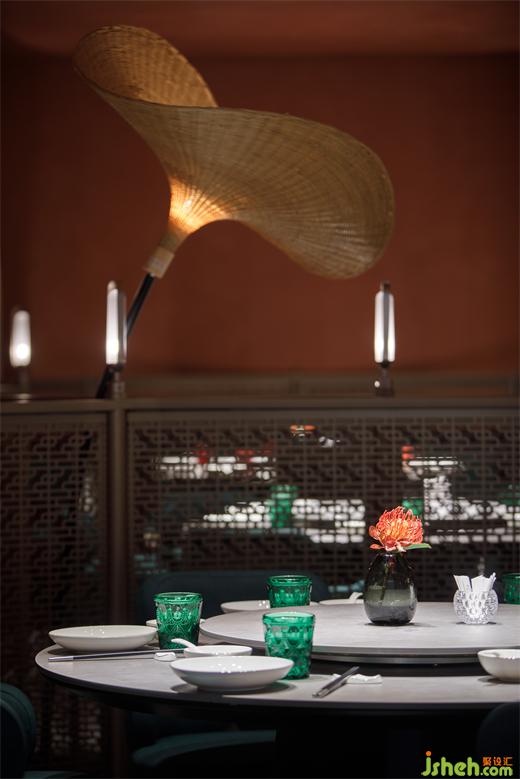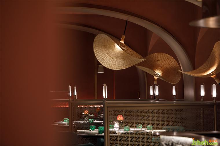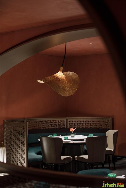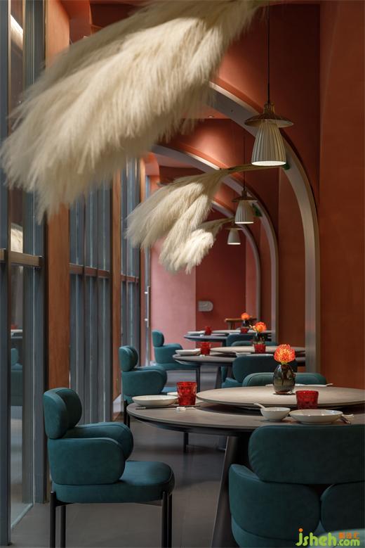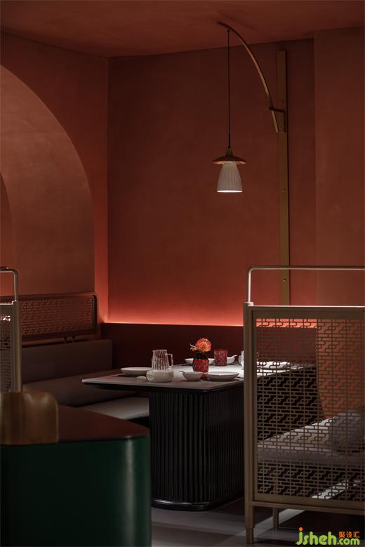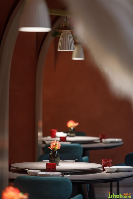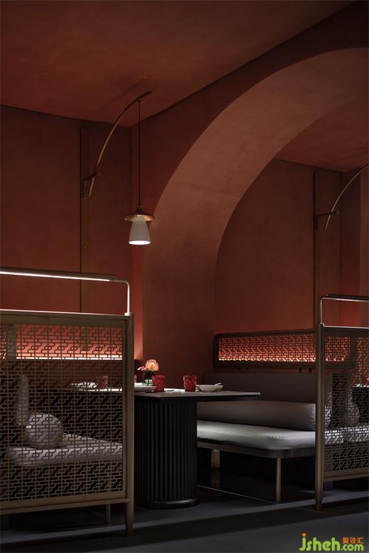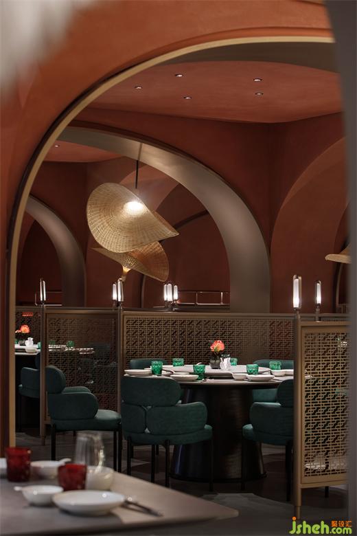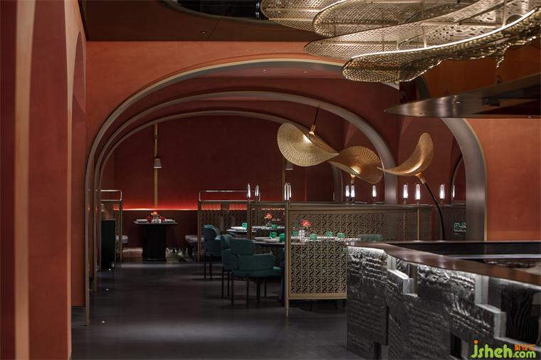从建筑外部延展至一层空间,连续的拱形元素将西北传统的窑洞建筑风貌置入其中,通过巧妙地排列叠加化解了原空间众多柱子产生的压迫感,在灯光的烘托下弧线造型更为圆润柔和,形成轻松惬意的就餐氛围。