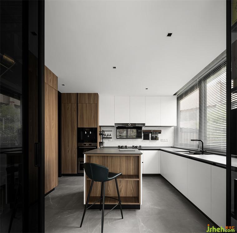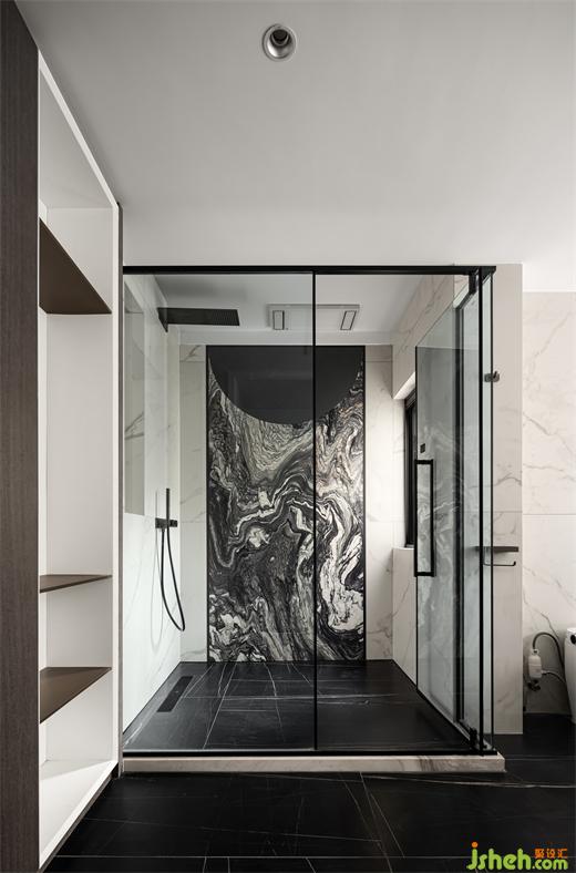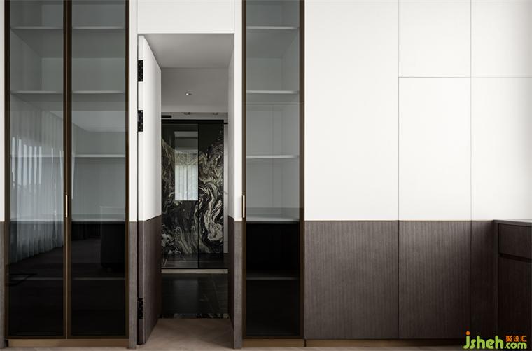 别墅装饰设计师同样以蒙德里安的艺术语言,亲手设计了玄关处柜体的柜面。没有复杂的装饰,仅仅通过点与面的组合关系,在横向与垂直的韵律节奏,彰显出独特的艺术感。