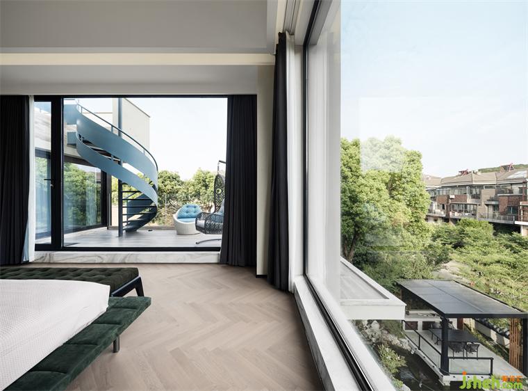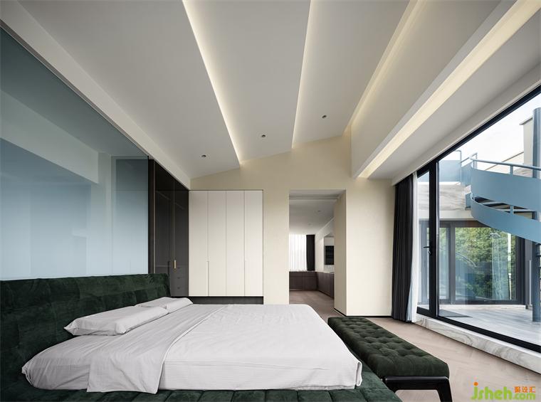 主卧被设计成一个视野绝佳之处,没有楼宇遮蔽和线路织网,只有星沉碧落和朗月清风。心宁入水时,即可视天地为衾枕,揽云月入怀中。