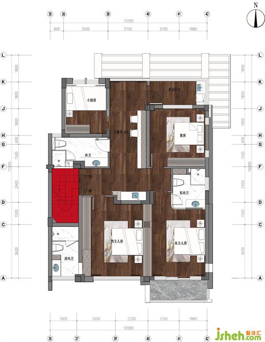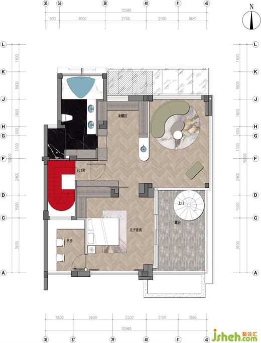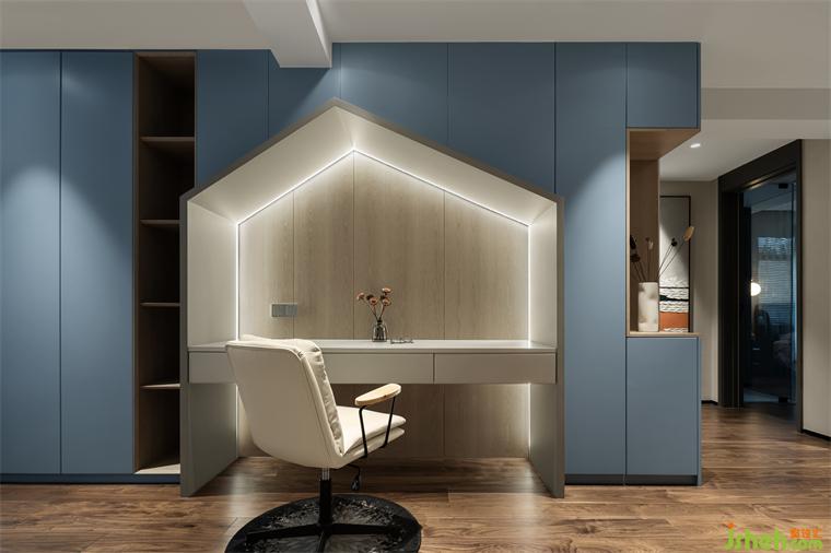 三楼是留给儿子的婚房,别墅装饰设计师将一整层设计成一个「总统套房」,配套独立的露台、起居室、卫生间、衣帽间和书房,基本满足日常起居、居家办公、私密社交等功能需求。