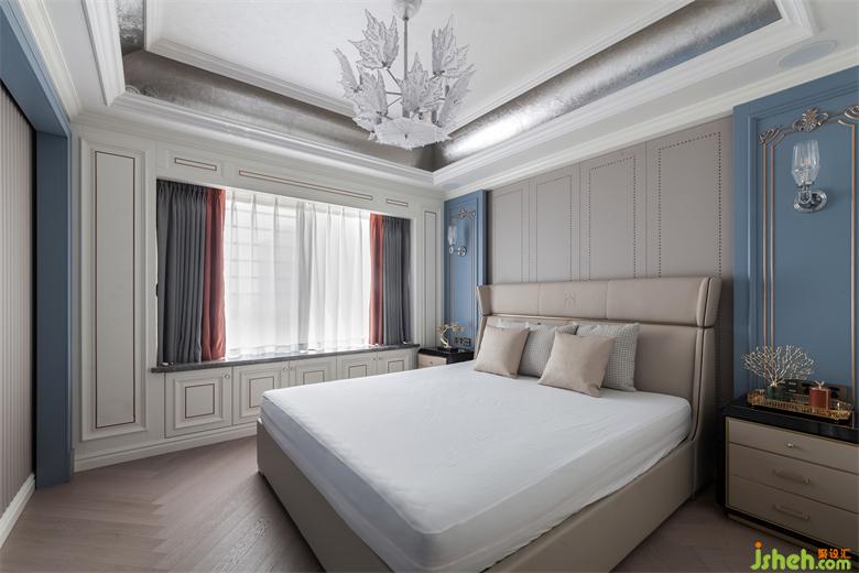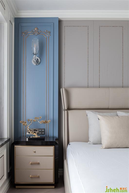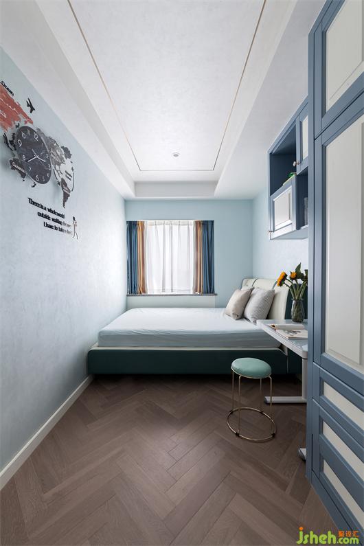 家居设计运用重复性、放射性、几何图案和线条,蓝色+白色的组合形式,进行结构与空间内的塑造,衍生出不同层次变化,色彩及元素由一个区域延伸至另一区域,床品与衣柜合理的方位布置,让生活情境与空间之间产生和谐舒适的互动关系。