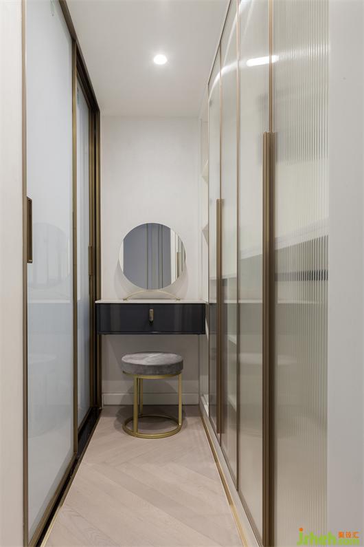 衣帽间是多少女业主的梦想,虽横向空间有限,但我们利用原建筑的下沉式卫生间的高度,为衣帽间做了纵向的延伸。增加储物量。