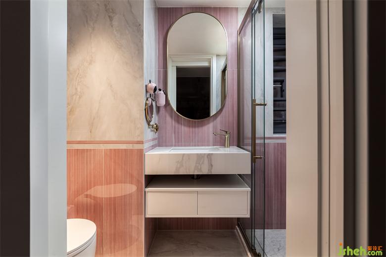 竖向的K金系列粉色半墙砖,延续着公主房里童话的味道。撞色的蓝色壁柜,活跃空间。