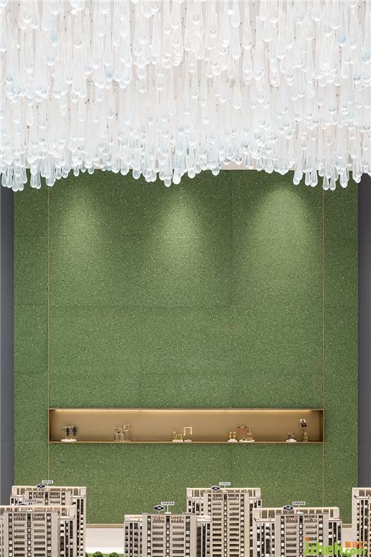 沙盘区的背景墙选用匠心工艺的绿色预制水磨石,嵌入式黄铜展架里陈列着珠宝,取代了以往的传统软装摆件,迎合女性消费导向。