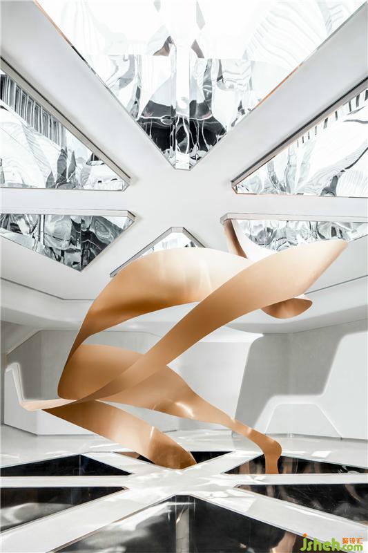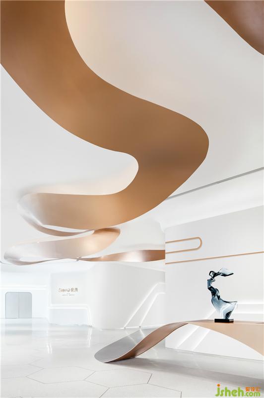 接待台雕塑是瑞典艺术家彼得曼德尔的作品,将古典纯洁与现代生活感的结合。如记忆中的每一个元素,自然中的每一种形状,既是静态的又是永恒的动态,亦如大时代下快速发展的深圳。装修设计