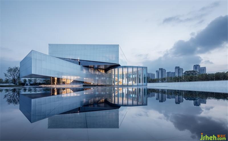 展示中心以悬浮于城市上空的山水舞台,展开的画卷、光影的立轴,构成的一种形而上的空间界面,而山水舞台强调以现代的材料和技术手法,将中国传统的文化、自然山水入画,由画入境,宛若人在画中游。