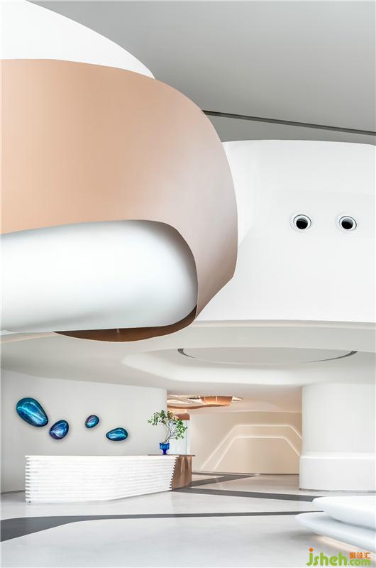 延展的画卷形成空间的视觉焦点,从建筑外围延续到室内,优美的长卷雕塑,如行云流水般上下贯穿,延续到接待台、再延伸到地面、吧台、楼梯,绵延生长。