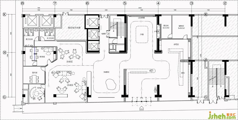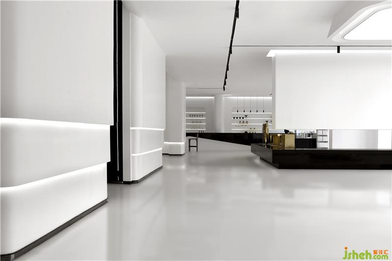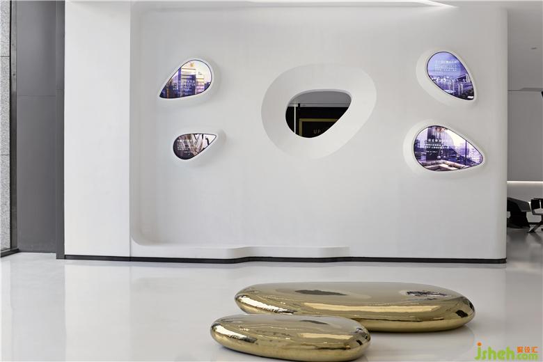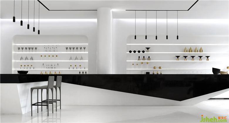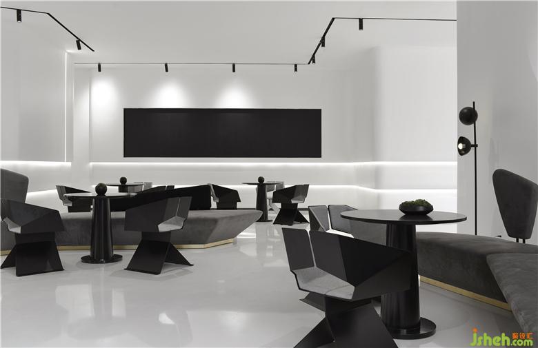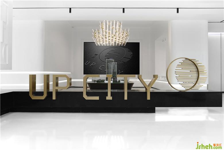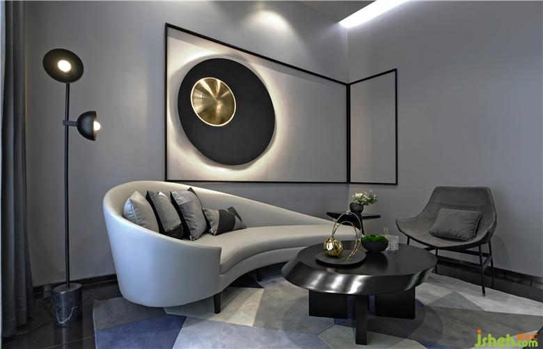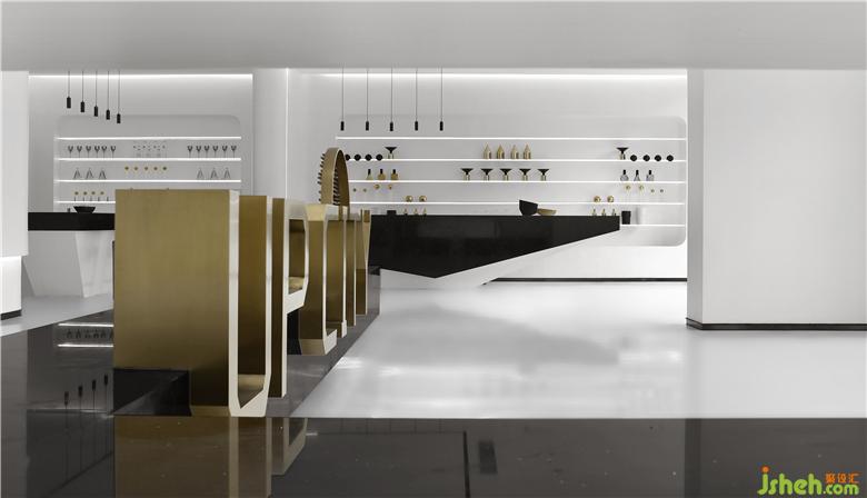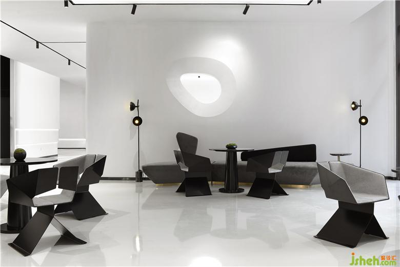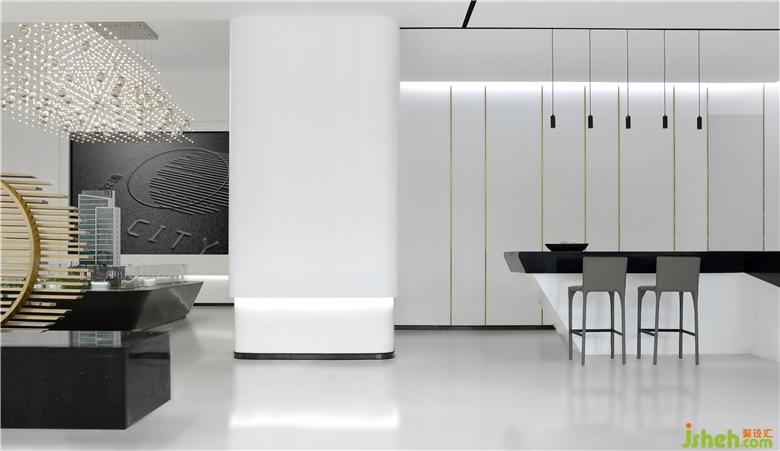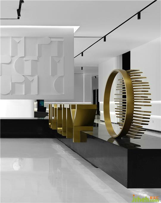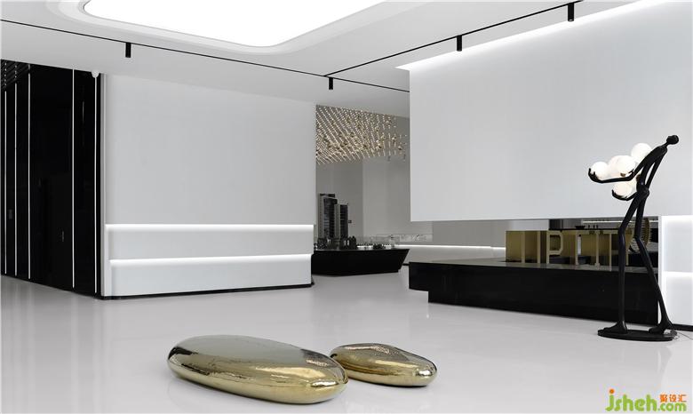 留白,源自于中国传统绘画的构图技巧,以无形绘有形。在黑与白之间,描刻出形与神的深邃意境,留予人无限的想象。被这一处白吸了眼,几缕似水般的光带,在空间中自由地游走,身影徘徊于明亮与阴影之中,不自觉的被顶面一道道摇曳的光所吸引着,引导访客其中漫游,思考,流连。设计师拿捏着空间的尺度,通过对形体、色彩、质感、软装来营造一个颇具性格的艺术之域,用造型的变化替代多材料的装饰手法。折线射灯与立面造型相结合,相应可产生深浅变化,形成层次。作品在环境风格上还是取用黑与白之间的对比,金色为点缀,克制与取舍往往才是走向无限的通幽之径。售楼处设计