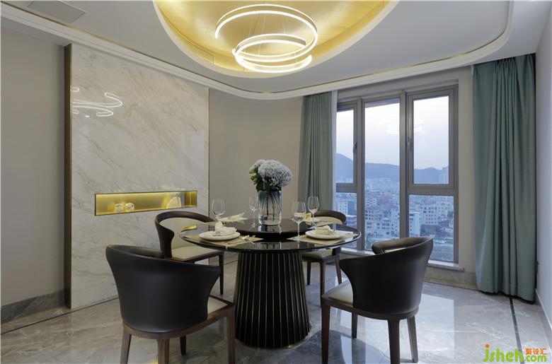餐厅原有的结构调整之后,客餐厅都变得通透开放,通过简约的手法,化方为圆。延续尊贵而雅致的氛围,略带华丽的环形吊灯,加上一面通透的落地窗,呈现优雅适意的用餐环境。