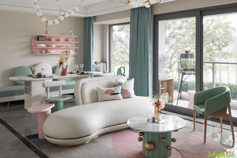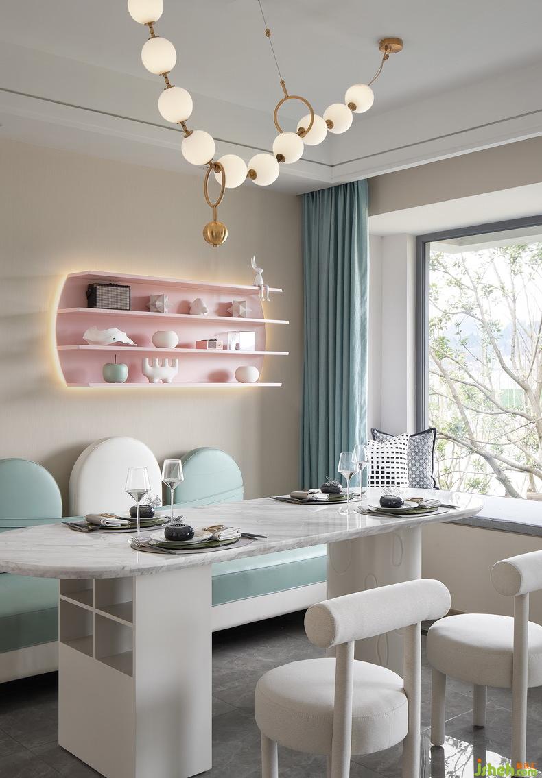 客厅里每一处的圆角家具,不仅给这浪漫的氛围增添了可可爱爱的元素,同时,也是对于家人的深一层保护。马卡龙的色系,让整个空间灵动活跃起来,也是保留在这空间下的每一个成年人与孩子的可贵童真。