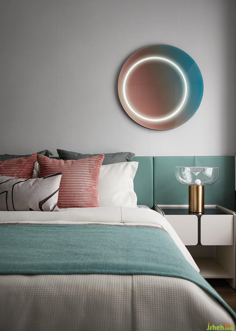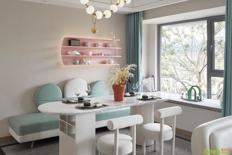 利用马卡龙色系普遍建立的大众色彩认知,让平凡的空间瞬间就有了浪漫、样板间设计梦幻、童话、跳跃的氛围。单只用了颜色这一个元素,就让难以描述的氛围感跃然呈现。