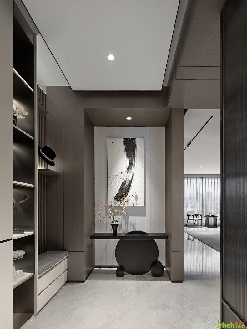 玄关作为一个家的序章,承载着传递初始印象的关键。这里大量运用深色天然木纹饰面,木材的温润结合冷峻的灰色大理石,既凛冽,更温柔。采用半隔断的方式达成过渡性质,以石材的延续形成与内部空间的沟通,自然引入