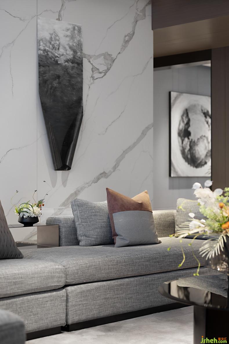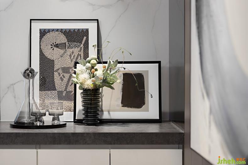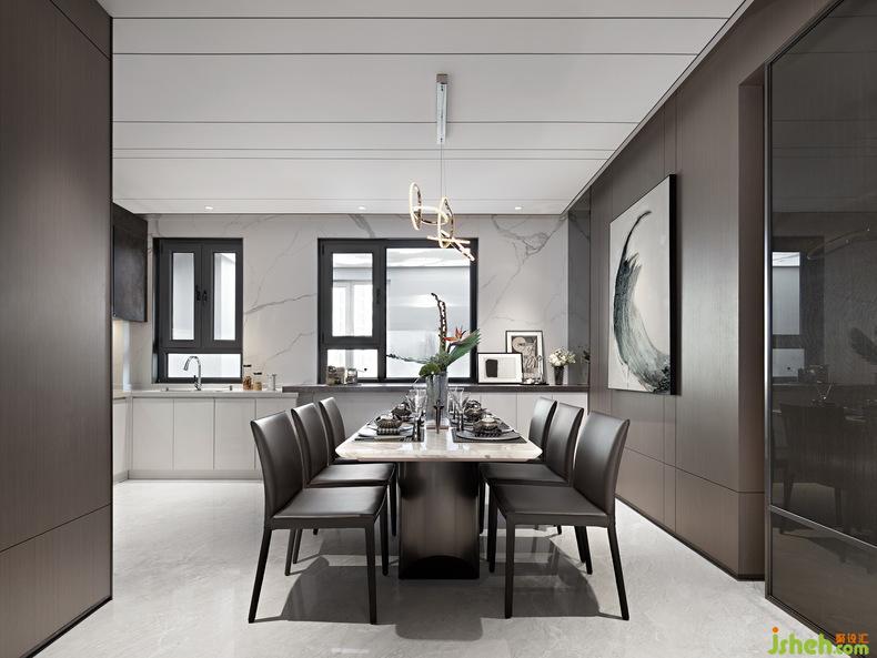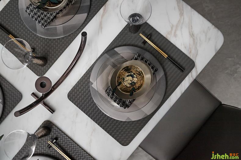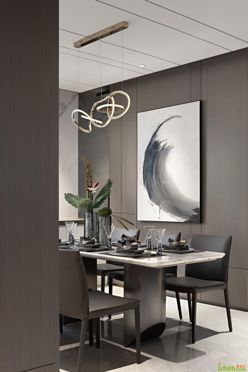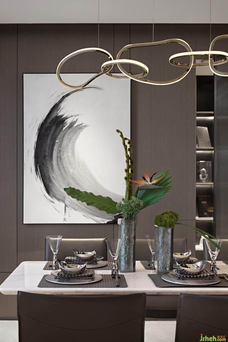 用餐区小到餐具的摆置搭配,大至挂画的考究,都彰显着高雅轻奢的气质。华丽的金属吊灯如跃动的音符,附着一家人齐聚进餐的欢声笑语、杯盏晃动、光影交错着渐变着,一曲爱与美食的家庭乐章就这样欣然奏响,绵逸柔远
