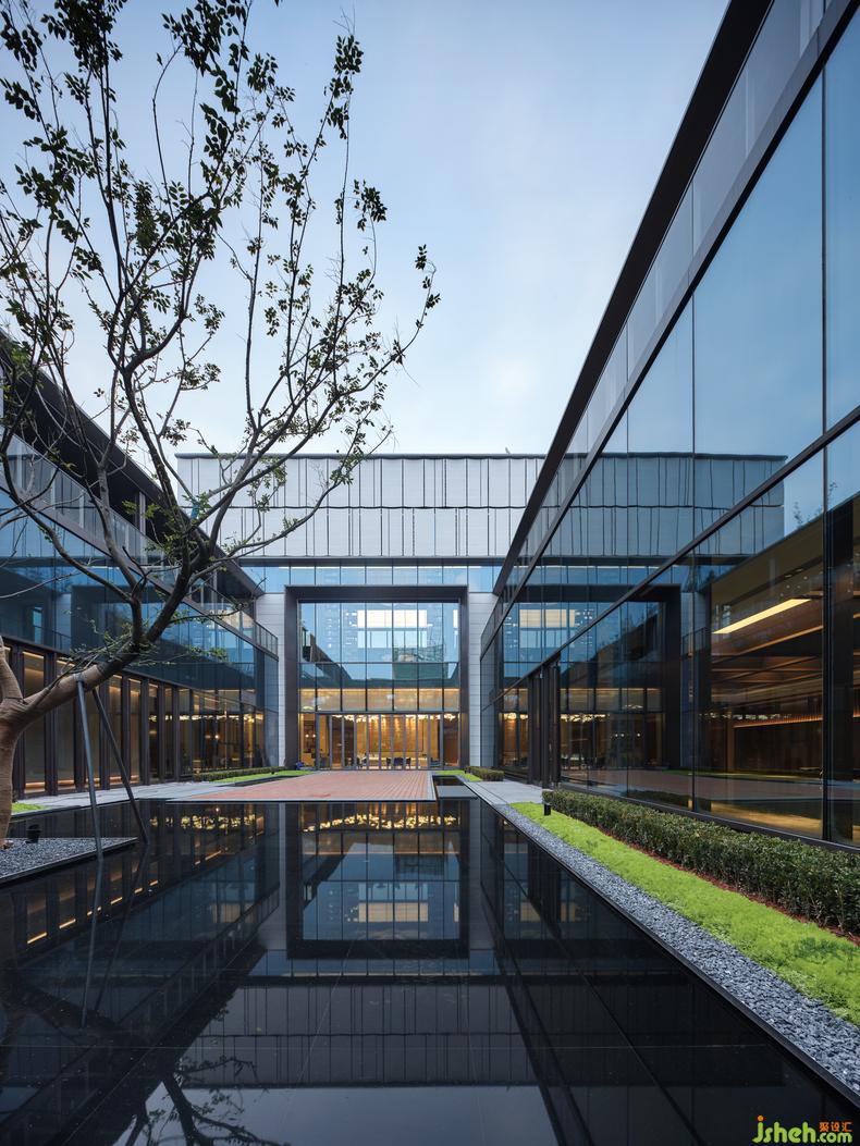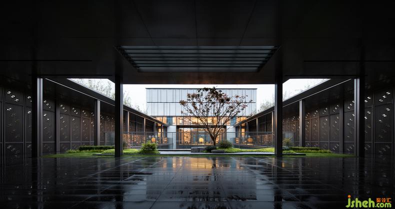 整个空间前后三进,层层递进,极具中式空间的含蓄与神秘之感。前后入口皆为亭,中部接待区称为堂,亭堂连接之处谓之廊,三者围合起来便是“院”了。 每一境都自成一派,又整体归一,既开放又包容,显然将空间探寻的主动权让渡于步入者:或为碧绿高枝吸引,或为镜面水光驻足,或欲沉入深邃,便择幽静长廊小步徘徊,独处慎思。