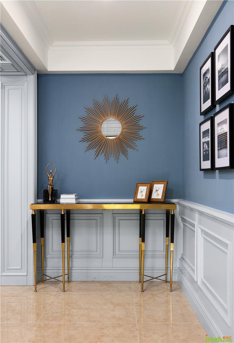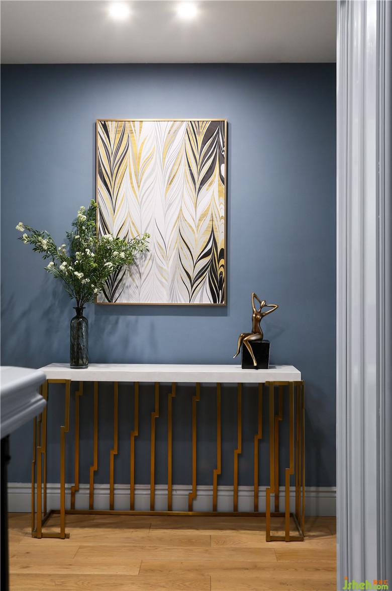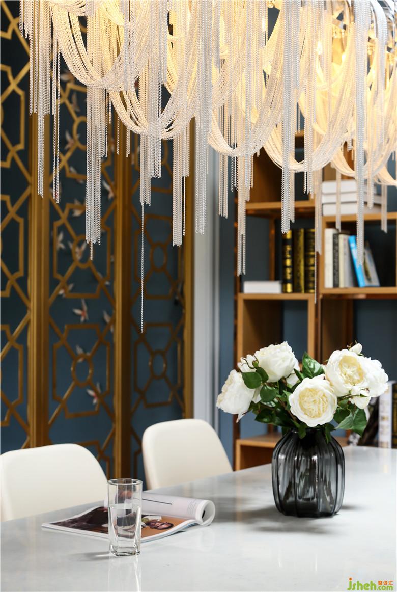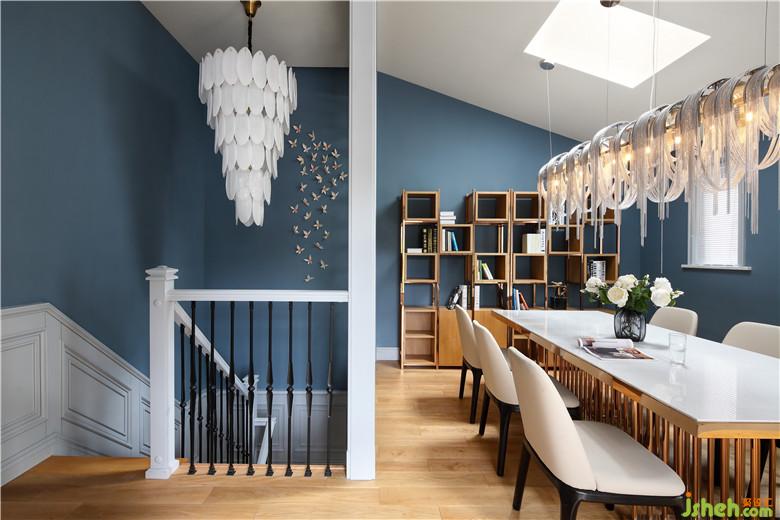家中的点点滴滴,我们都会发现业主对生活的热爱,理性感性缠绕中和,在三层的多功能厅显现更甚。楼梯间羽毛灯源,优雅、朦胧、内敛;独特的主灯,不规则的书柜,金属的搭配,相互交织,在主色调蓝灰色的空间内,给予了生活的激情。