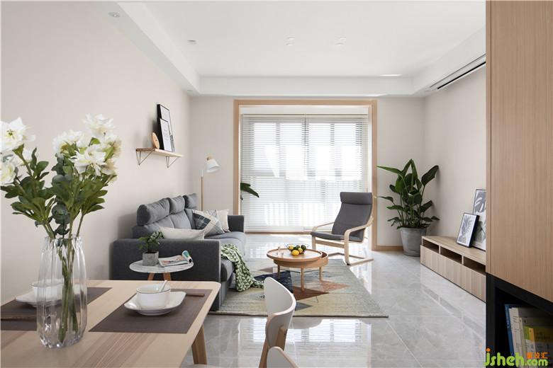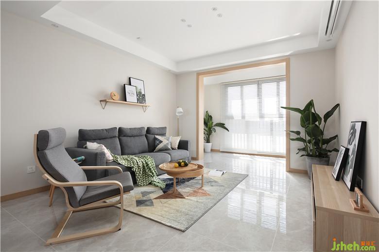 灰色的沙发在空间中有着突出效果,低饱和度的色彩营造出柔和的空间氛围。布、木、土,自然基本元素给您带来全身心放松的自然生活环境。舒适柔软的地毯,图案没有格外的绚烂,细腻的触感,踩上去特别舒适,室内设计师再配上几个不同形态的抱枕,散发出清新的气息,在平淡中流露着美丽。角落的这株绿植是天堂鸟,也称鹤望兰。这种中大型的室内绿植置于空间边角,有很强的装饰性,点亮稍显冷淡的客厅,可以让视觉有所重点。