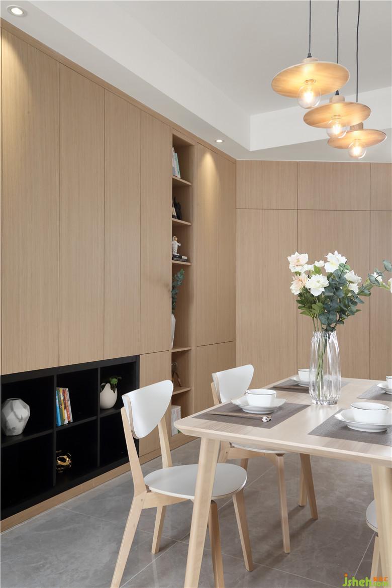 原木色的餐桌、质朴简单的瓷盘,室内设计师加上暖光源的吊灯,让整个餐桌显得更加文艺温馨。厨房窗外可以看到一览无遗的天空,连最讨厌的洗涮也变得美好起来,进门旁原木架上还摆放了晶莹的储存瓶,可以储放些杂粮,也是一道风景。