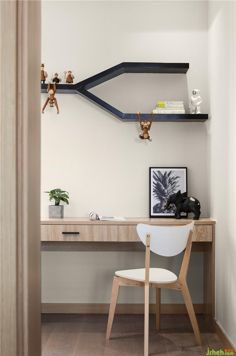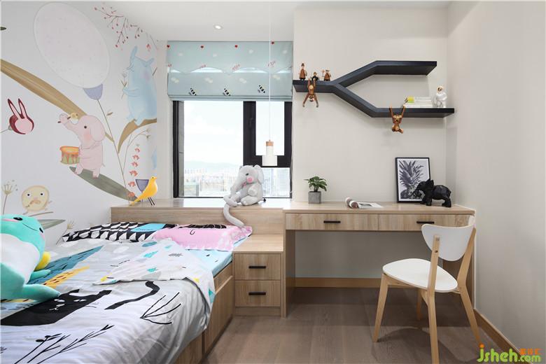 儿童房里制作了有着强大收纳功能的榻榻米,小小的空间里划分出了学习区,搭配着充满童趣的各种小摆件,整个空间多彩缤纷。