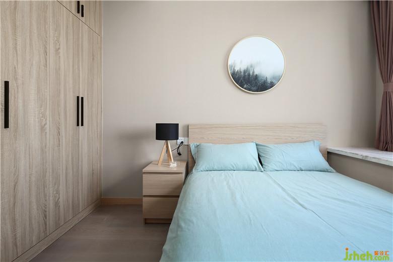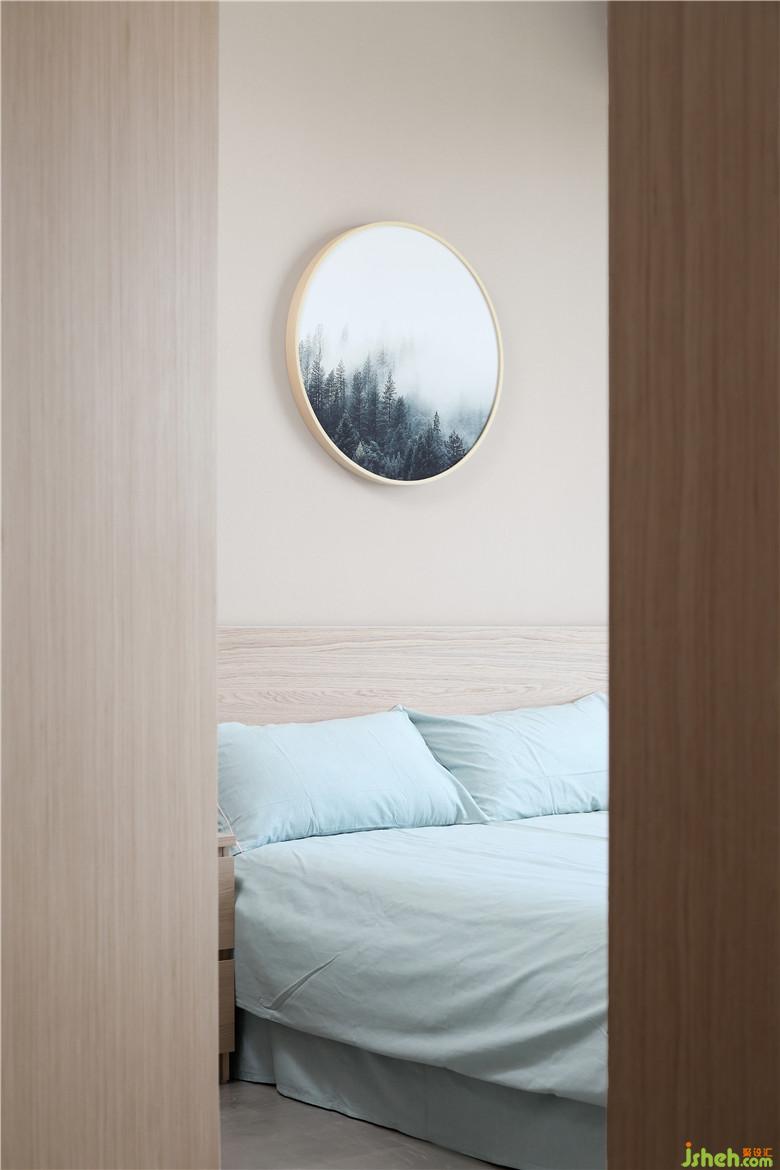 客卧一入眼就是床头的挂画,室内设计师搭配淡蓝色床单、木色衣柜,感觉空灵与宁静。
