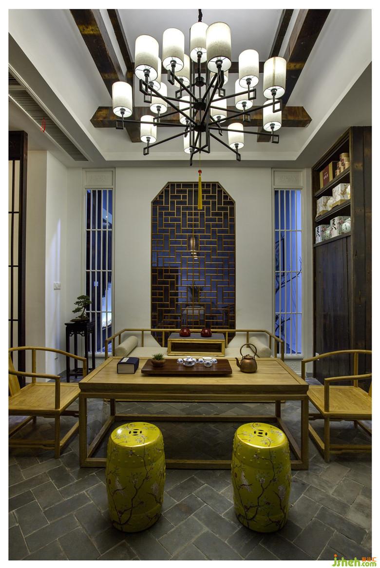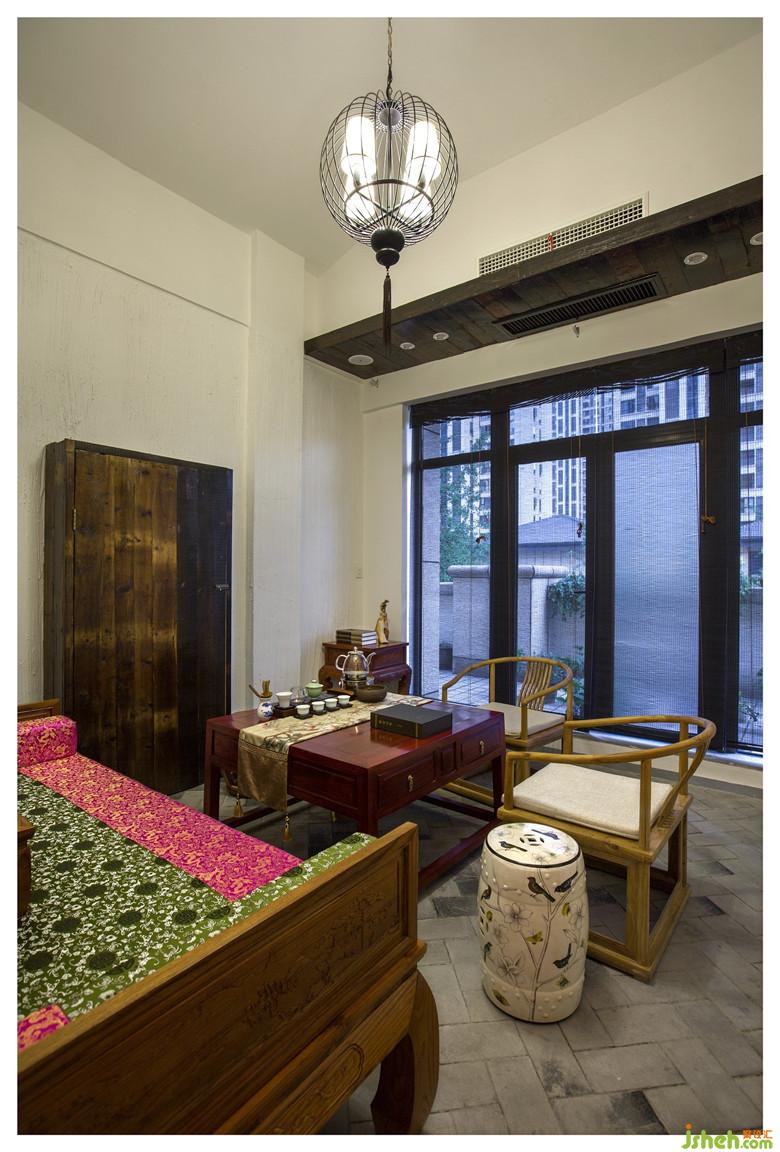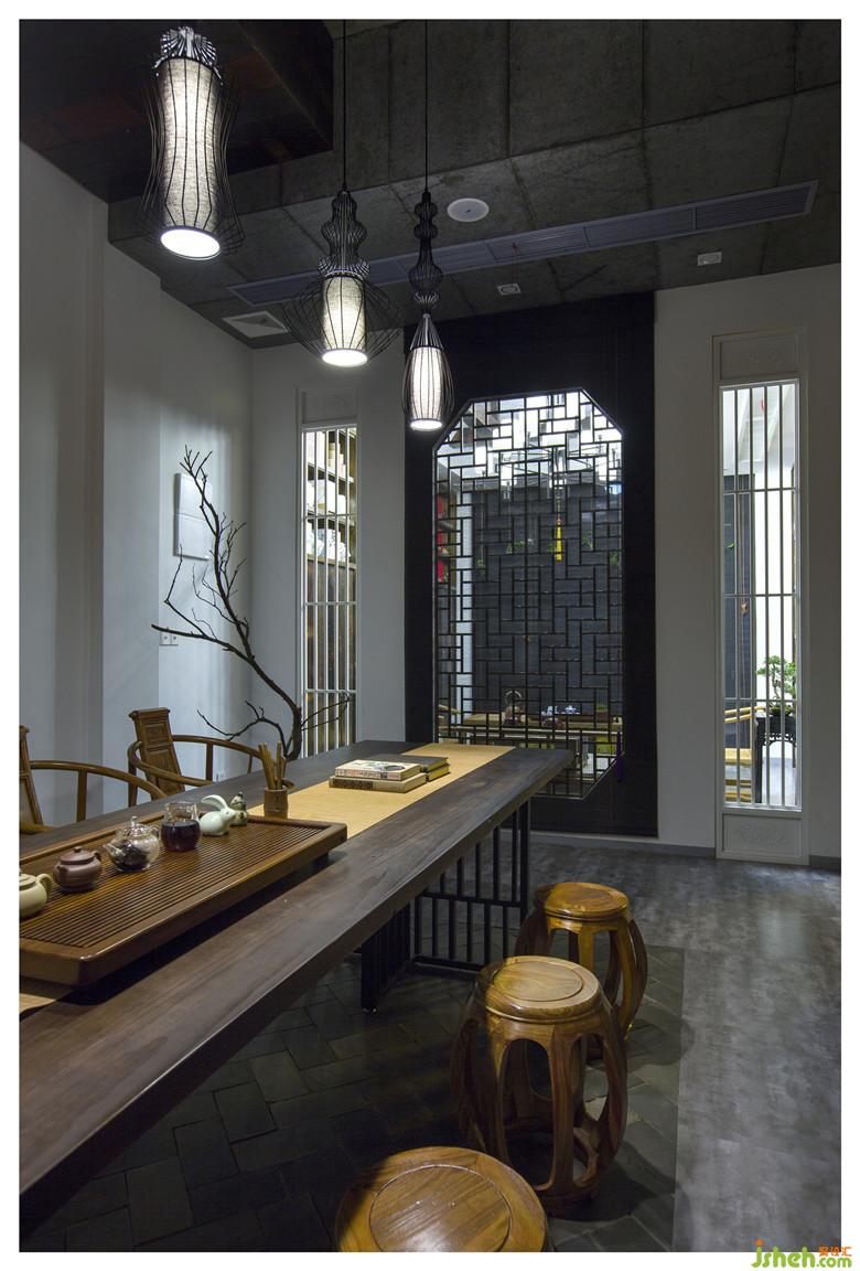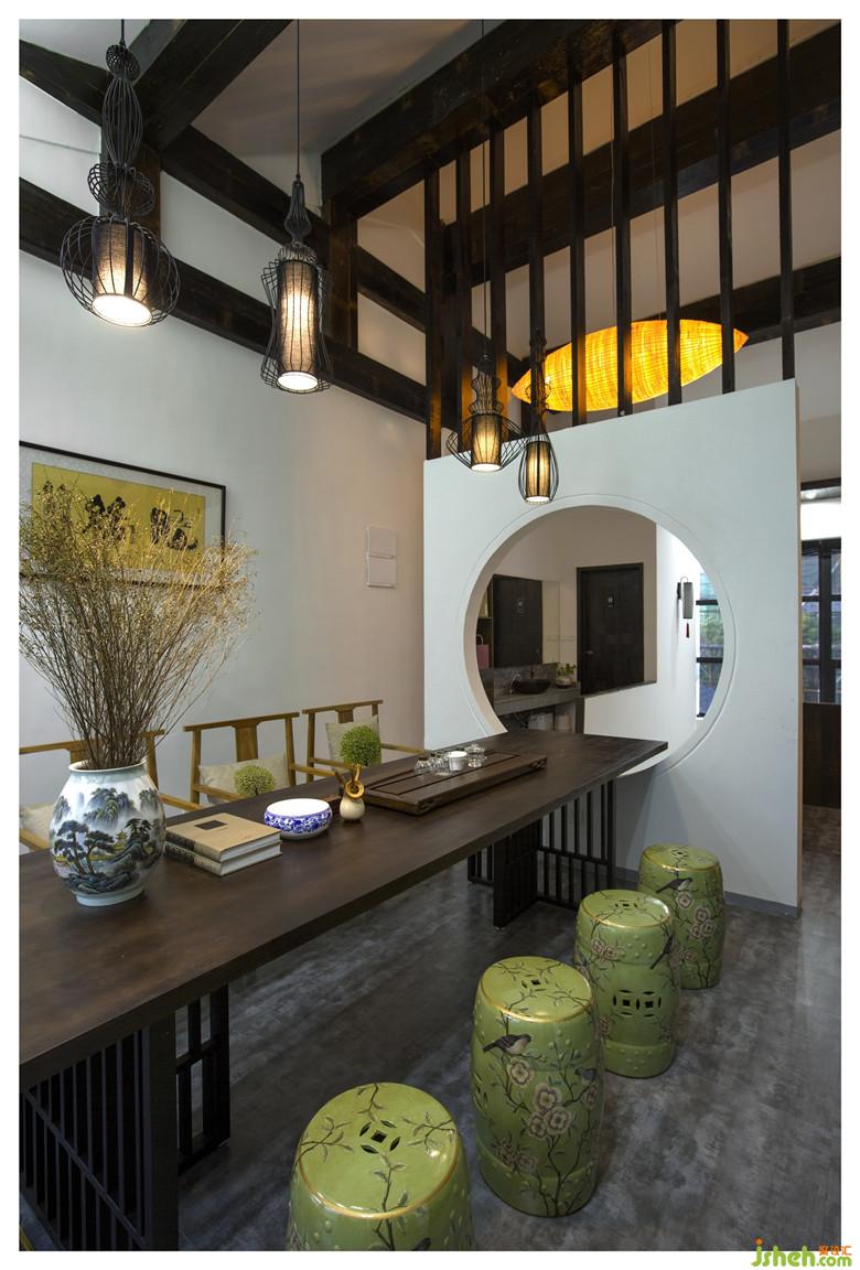 室内设计师打破原本的混泥土框架结构,采用拆房老木材来打造中国传统的梁架结构。拆房老木材梁架不仅承载了沧桑的岁月印记,凸显了结构的形式之美,还拉伸了空间的视觉,可谓一举三得。地面则精心以老青砖和石板铺就,台阶古朴而又厚实,划满了时间的痕迹。