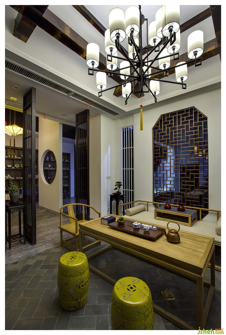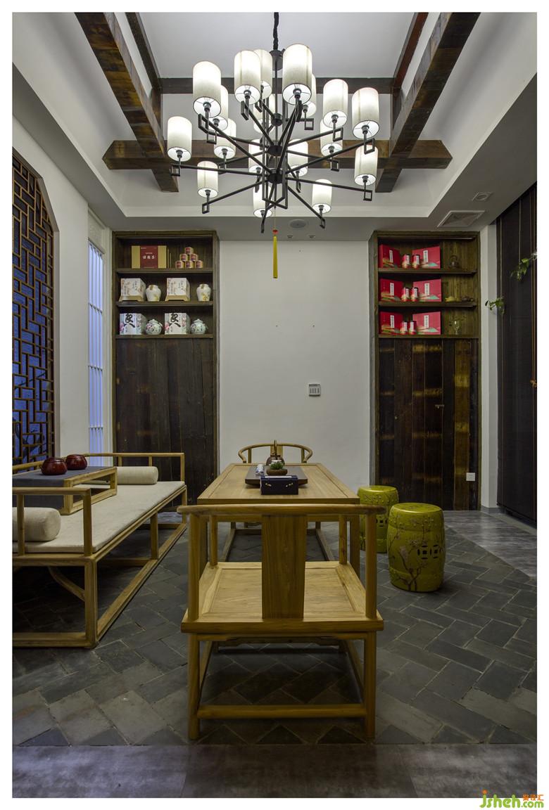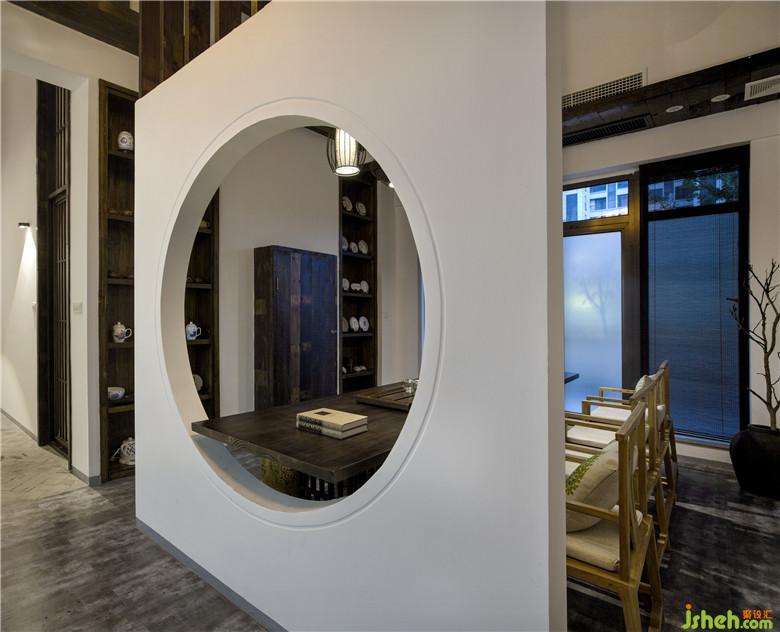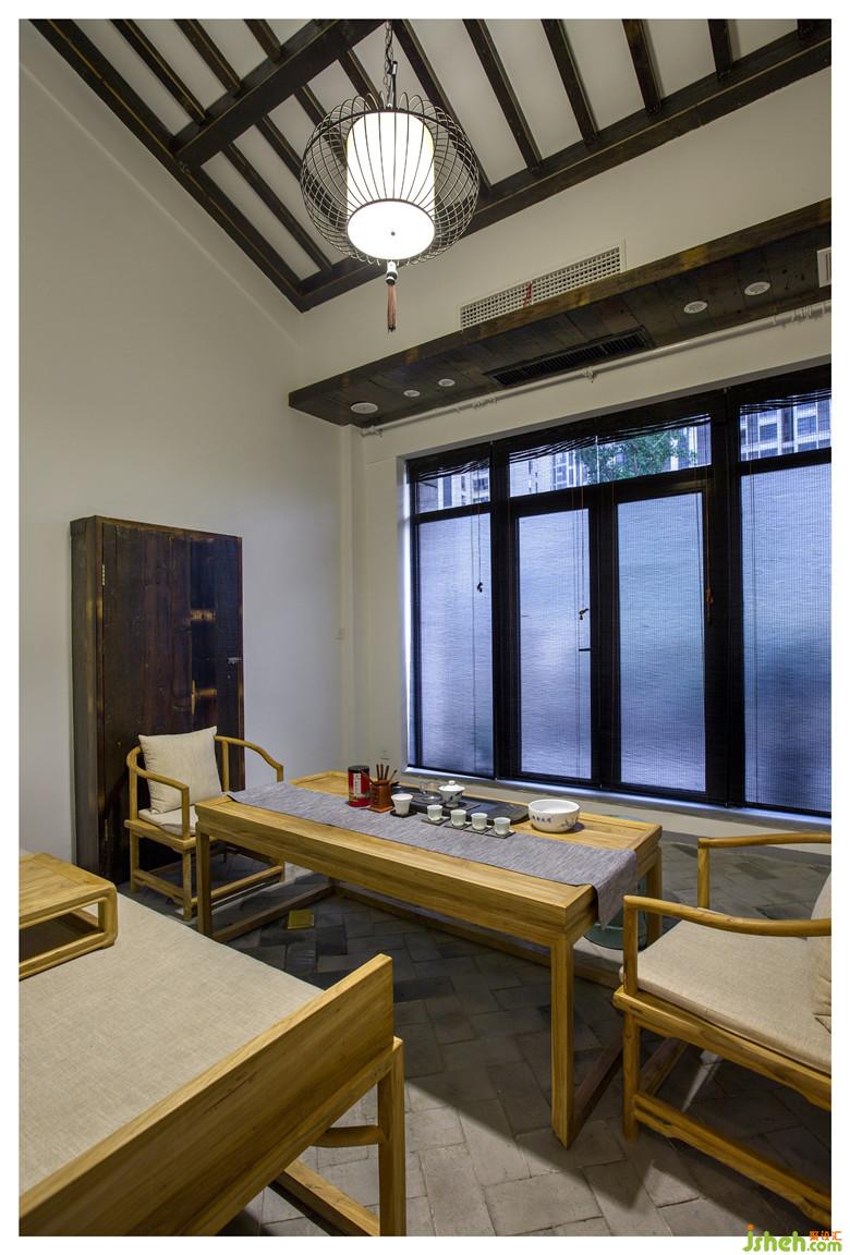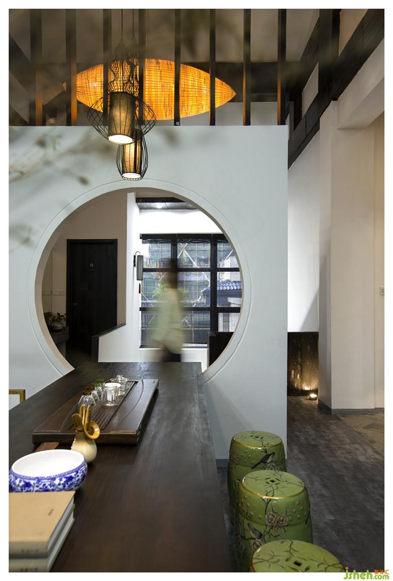 合围的客人接待区素木桌椅古色古香,十足雅致的茶具、年份久远的陈茶好似穿越了时间的界限,这种繁花落尽的细微之美渗透了东方华夏几千年的文明,安静了世界的浮华。一条长达4米多的条形案台映入眼帘,这是茶室的公共区域,枯枝在角落中找到了支撑点,傲然萧瑟,美得别致,案台旁配以精美石凳,栩栩如生的图案,鲜亮的颜色并不跳脱,反而带动了空间的生机活力。