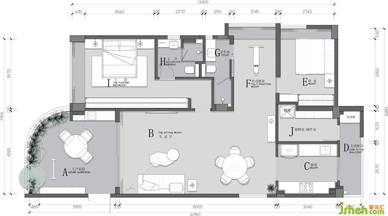空间格局的重构是本案的灵魂,设计逻辑由此呈现。在布局上,设计师充分考虑采光,打破多个封闭墙体对空间的切割,保留四面落地玻璃窗,通过借景的手法将自然光线引入室内。从玄关到客餐区,再向私密空间延伸,环游式的动线,自如的进退节奏,在此徐徐展开。