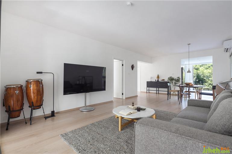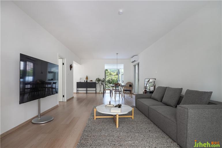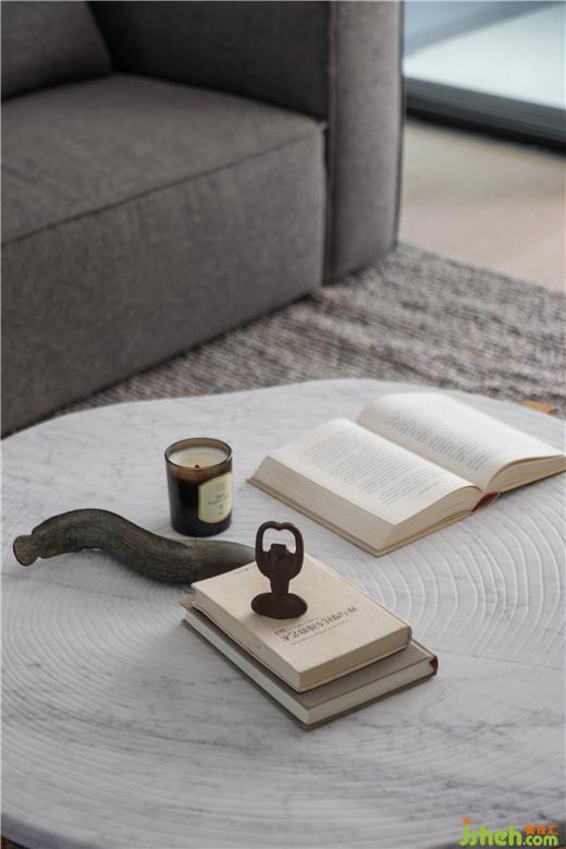 一呼一吸间,流动的山风,大面积的留白,消弭了室内与室外的界限,各功能区彼此贯穿性地联接,私宅设计创造出空间的通透性和流动性。家居和饰品成为氛围的延伸,木色地板搭配灰色布艺沙发和地毯,简约的线条、柔软的材质,让心灵归于平静。茶几选用洞石石材,呈现出天然的肌理感。