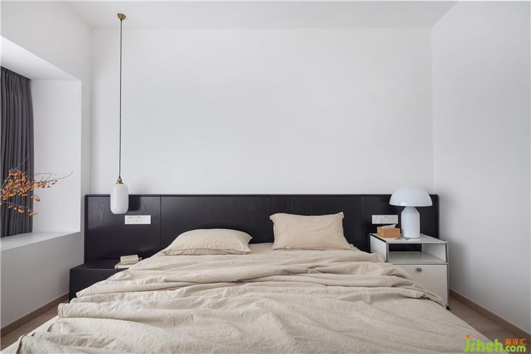 主卧通过横向大衣帽柜的置入,构成卫生间于一体的套房式空间。私宅设计延续低饱和的色彩系统,米色棉麻床品、白色灯具,搭配深色系窗帘、木纹理床具,不张扬的氛围,塑造静谧的睡眠环境,呈现质朴、沉淀的韵律。