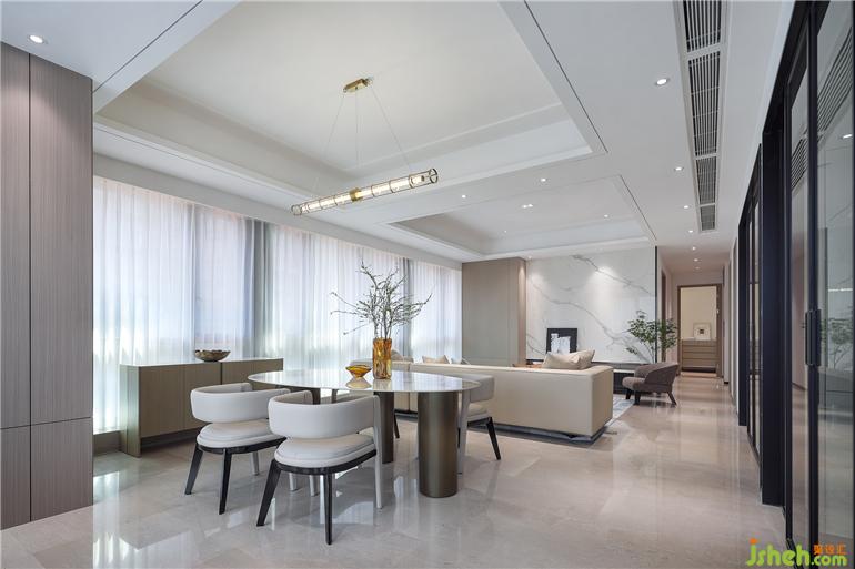 设计师关注软装细节的连续性,以此凸显视觉延展的意趣。弧形岩板餐桌搭配白色围合式皮纹餐椅,橘棕色玻璃花器点缀其中,木色餐柜与墙面色彩呼应。大平层装修设计圆筒状吊灯洒下柔和的光线,简洁的色彩,多层次的材质串联起一日三餐的仪式感。