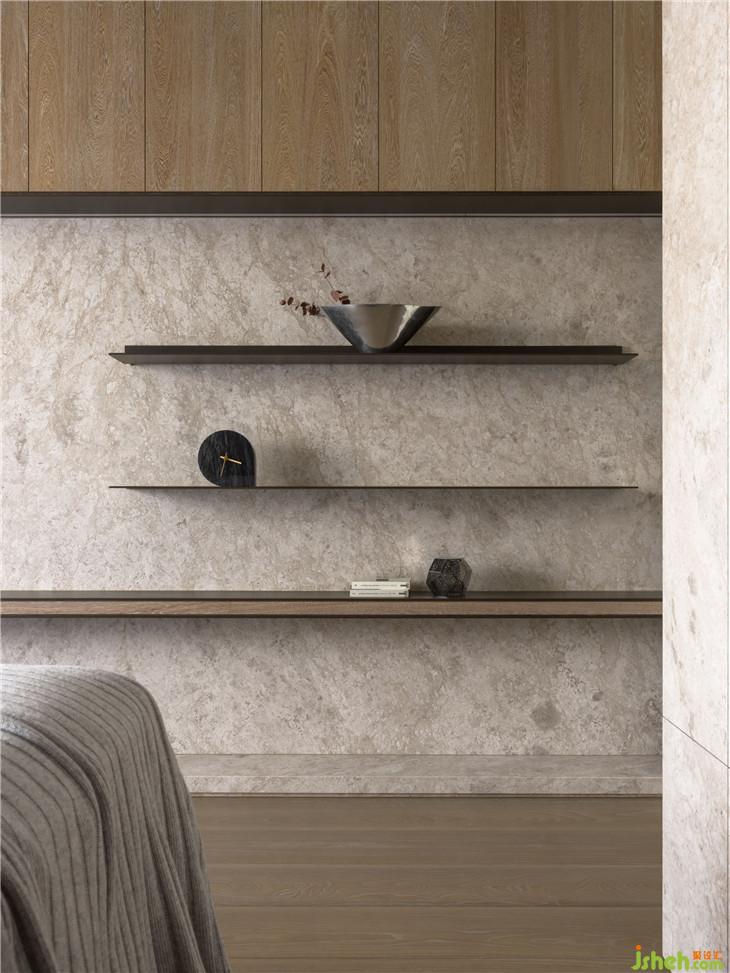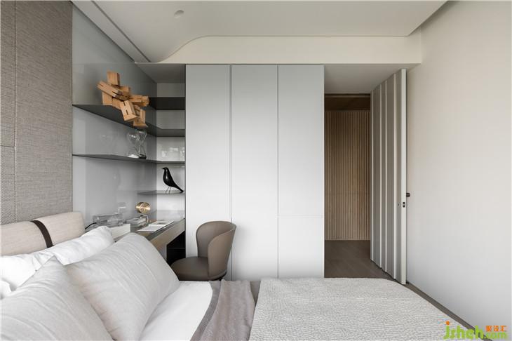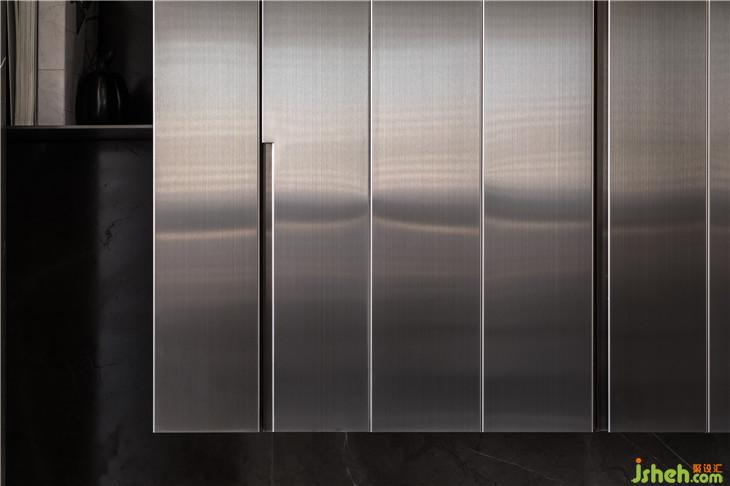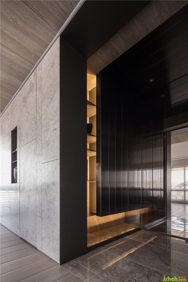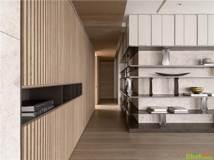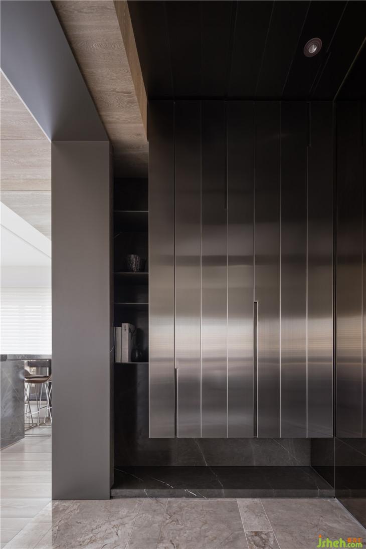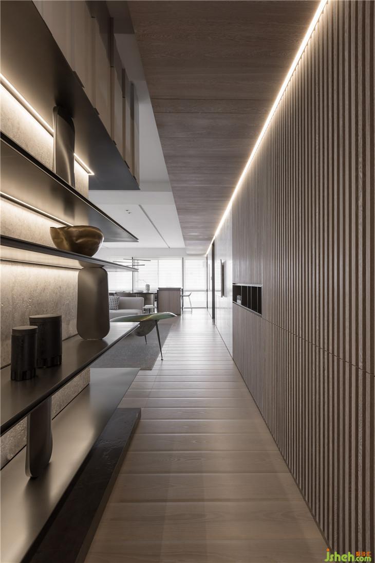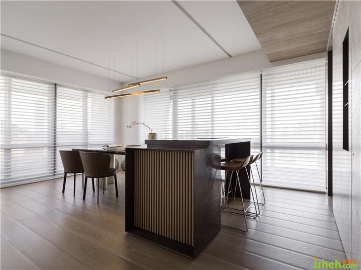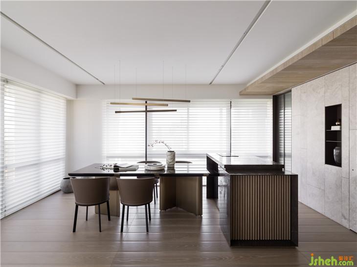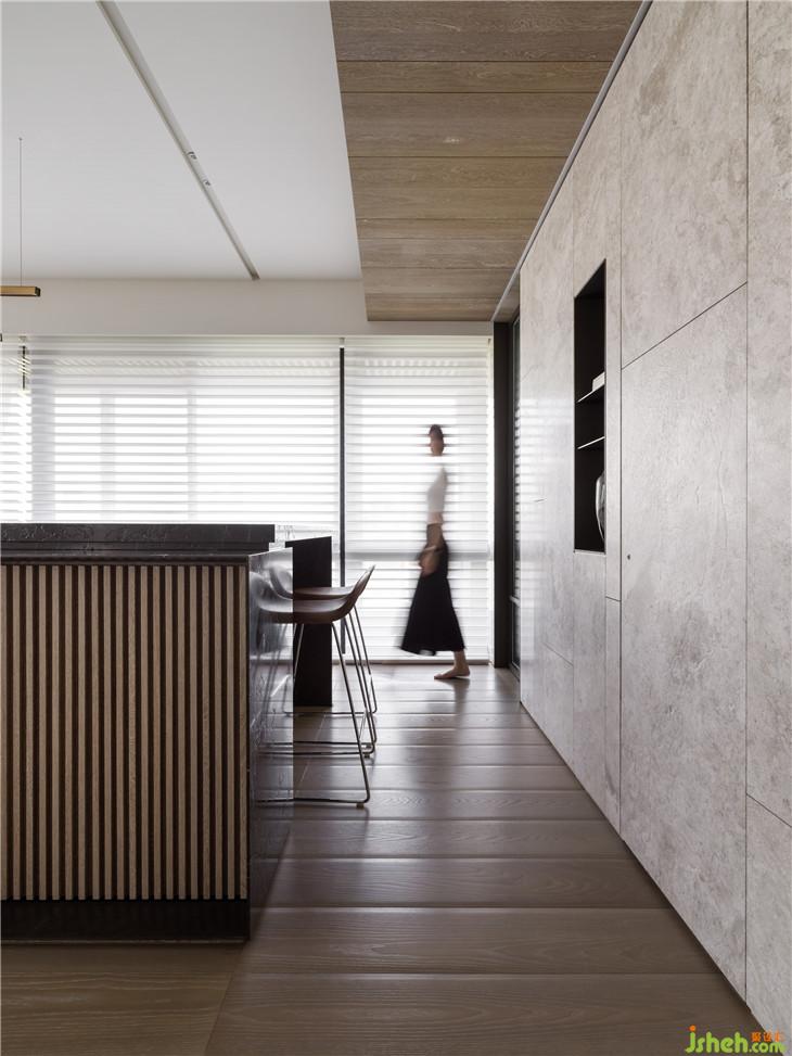 透过材质本身,传达温润传达温暖的空间感受。 透过仪式感玄关的体验,利用不锈钢材质连结到整体空间创造一个重点的空间转换的心理感受,经过玄关进入整体开放式的区域,包含西厨中岛、客厅书房,以一道大面积的格栅牆面让整体开放空间有更完整的连续性,开放式的家庭中岛作是居住的核心主轴,利用中岛的量体创造空间中的主要元素。另外在客厅的布局上,巧妙的转换了电视墙的方向让廊道的部分结合了电视墙前方的空间,形成了更连续且延伸的轴线,也让整体空间在视觉上有更宽敞的感受 。色彩计画以一个比较米色系温润的木质感作为主要的设定,传达家的温暖,让家充满阳光、充满笑,是温暖温馨的一个空间体验。