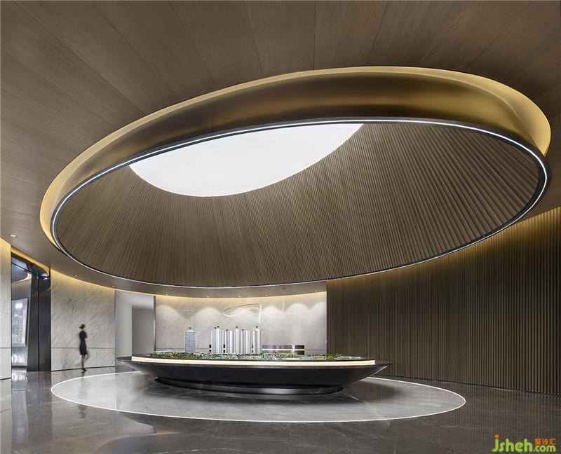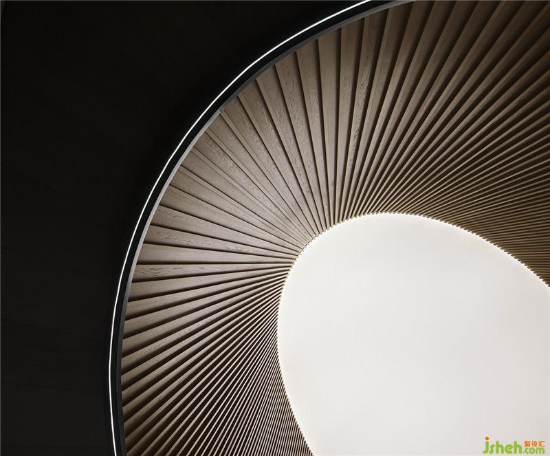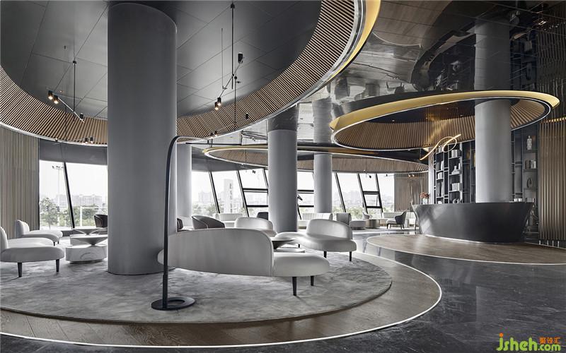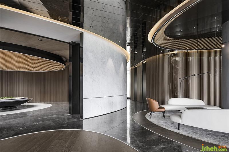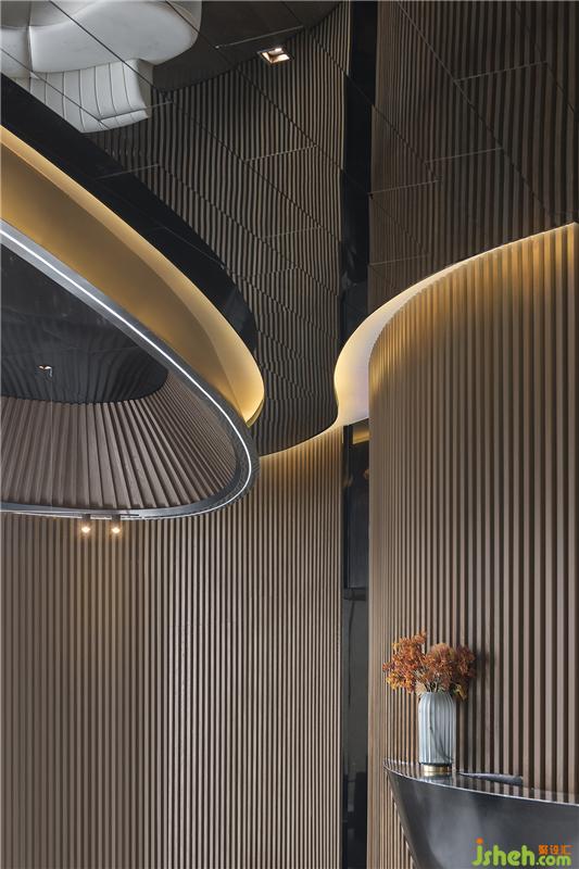 各种水的姿态在藉着空间中长弧形和圆形的墙面规划,弧线化作室内一道又一道的量体结构,弧墙的韵律配上水的直落线条,体现出了空间中的各种层次.