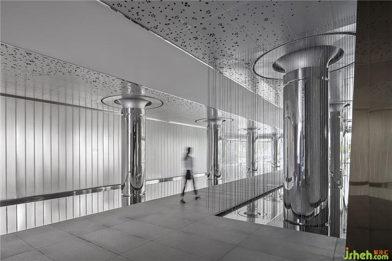 运用材料的温润感透过分割肌理化,好像水从上而下的落坠,天花吊鼎的不锈钢材质像天空又像平静的水面整个翻转过来,让人在行走中都能感受到空间中有动又有静的空间韵律感受,