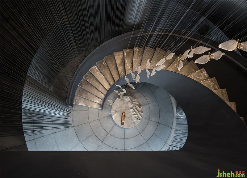 入口以一道旋转的天梯作为启始,每一步都像走在水流之中,光线透过垂帘每一步的影子都有不同的感受