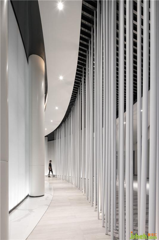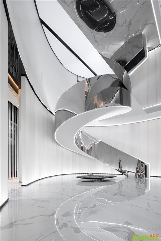 在入口空间,设计师以「穿透介质,模糊空间边界」为架构,由一楼天方地圆的形式展开,打破既有轴线的安排,利用弧线型的动线活跃空间的体验感。室内设计师