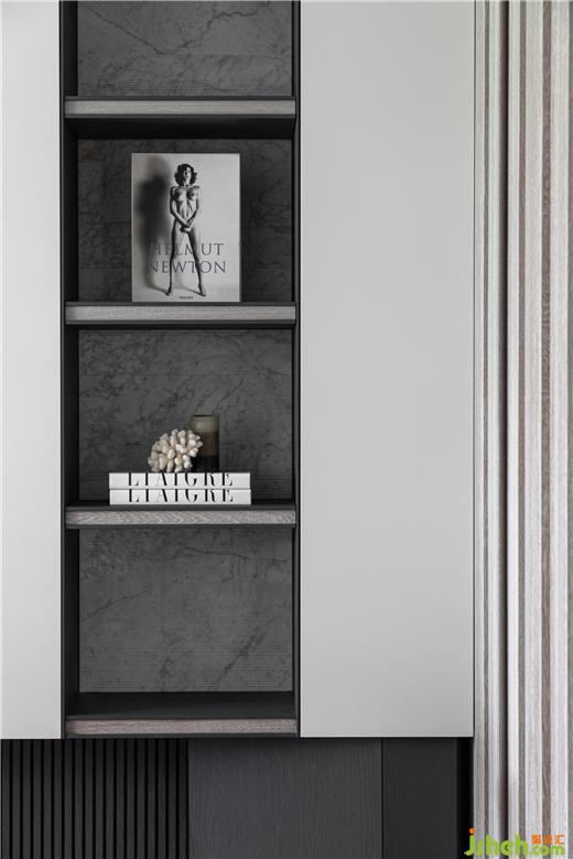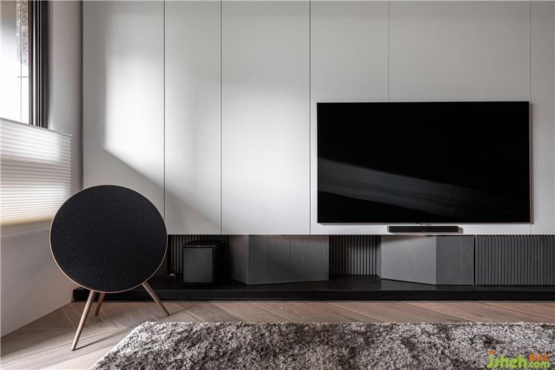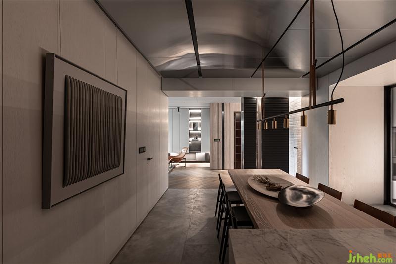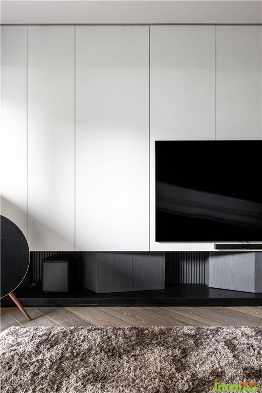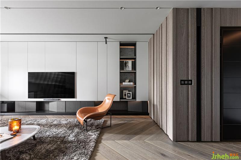 玄关的木饰面律动性的转折延伸至客厅空间,包覆并隐藏了大型收纳柜体。