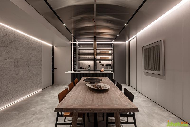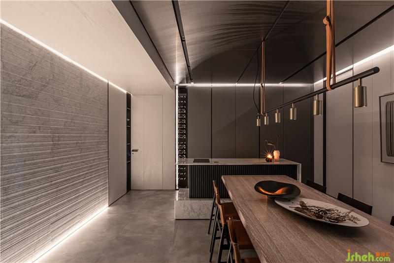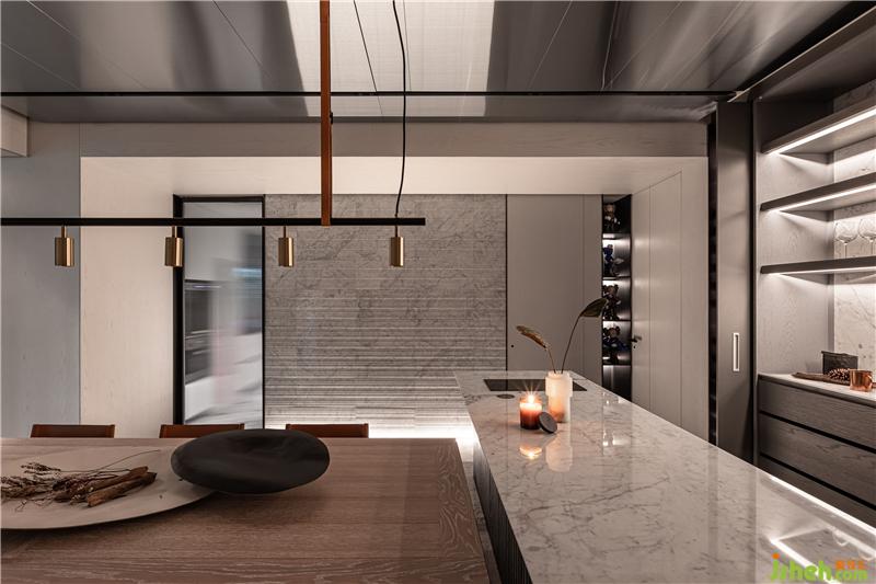 入门以带立体纹理的卡拉拉白石材板连贯至中央餐厅主墙。
