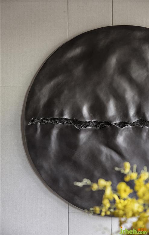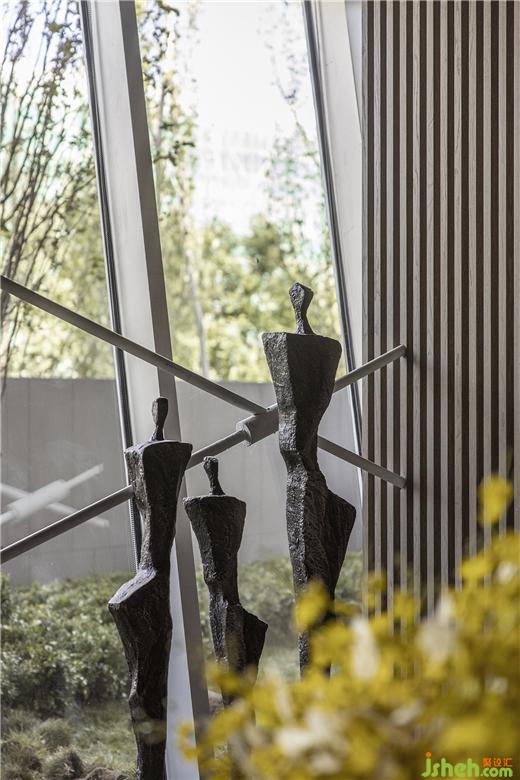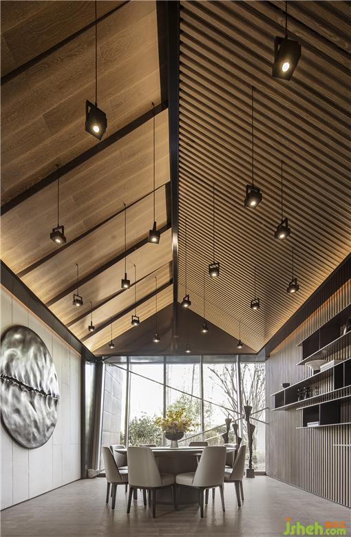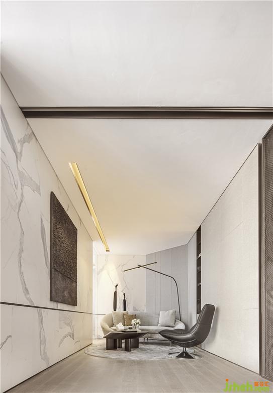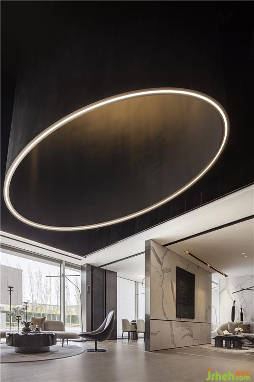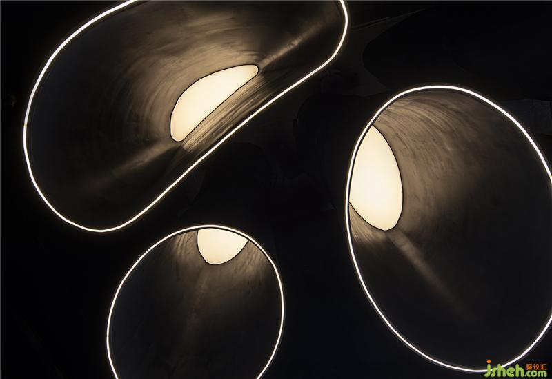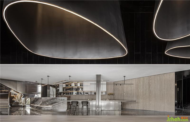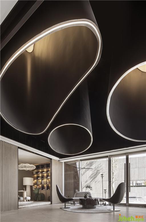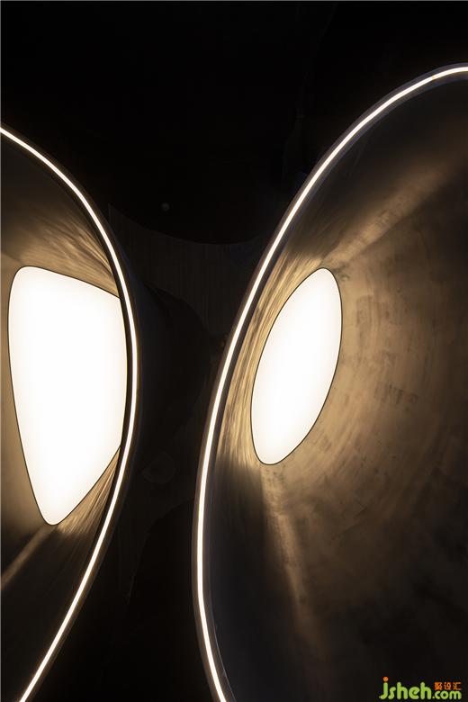 经L型水吧台的动线引导,圆弧形设计语言延续至双倍高的洽谈区域,天花布满数个洞穴式的艺术装置,寓意城市变迁背景下由现代迈向未来的引擎。异形薄片以基础模型打样施工,凝结着艺术的精确与科学的激情,挑战大众眼中的习惯与常识。