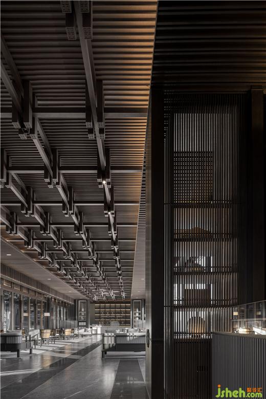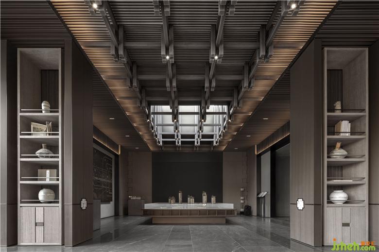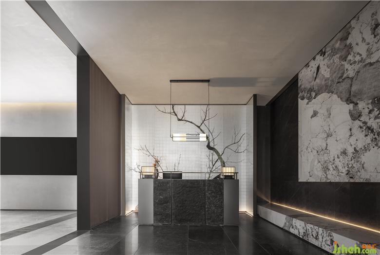 前廊设计序列的屏风,构建空间东方“礼”的场域,形成心理仪式感的转换中正形直的接待台,辅以灵巧精致的金属构件,以精工的手法传达细腻的工匠精神,传达东方礼仪之美。背景题材取自古典中式画屏,与自然水墨纹理的石材交相呼应,构建立体的画境空间。