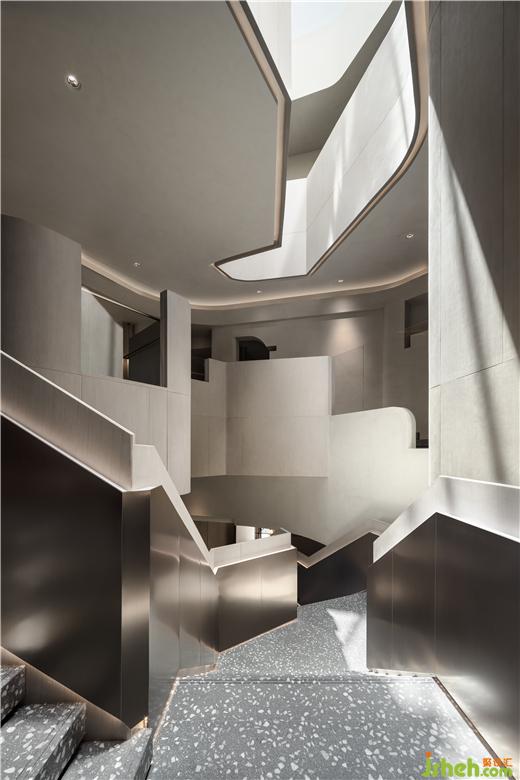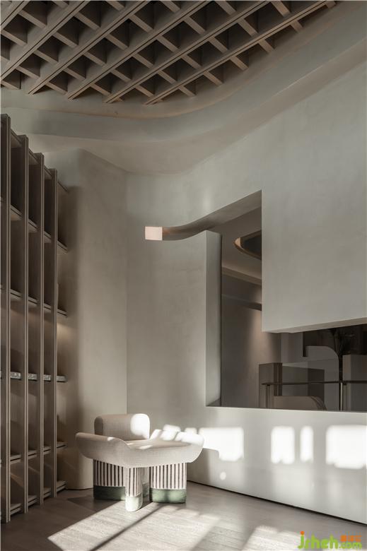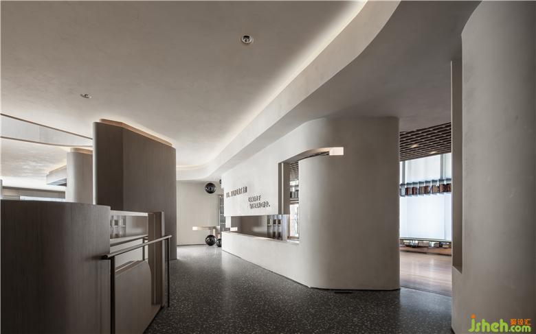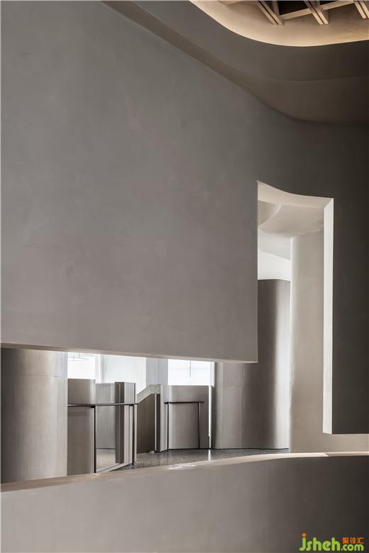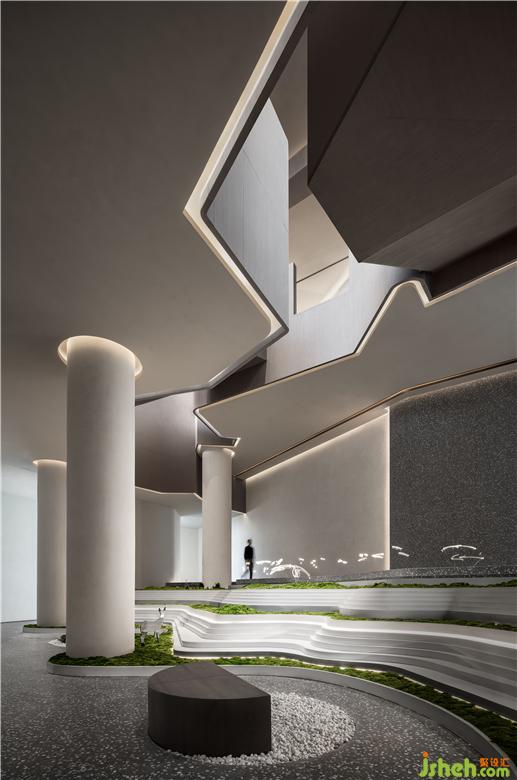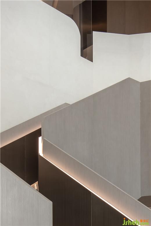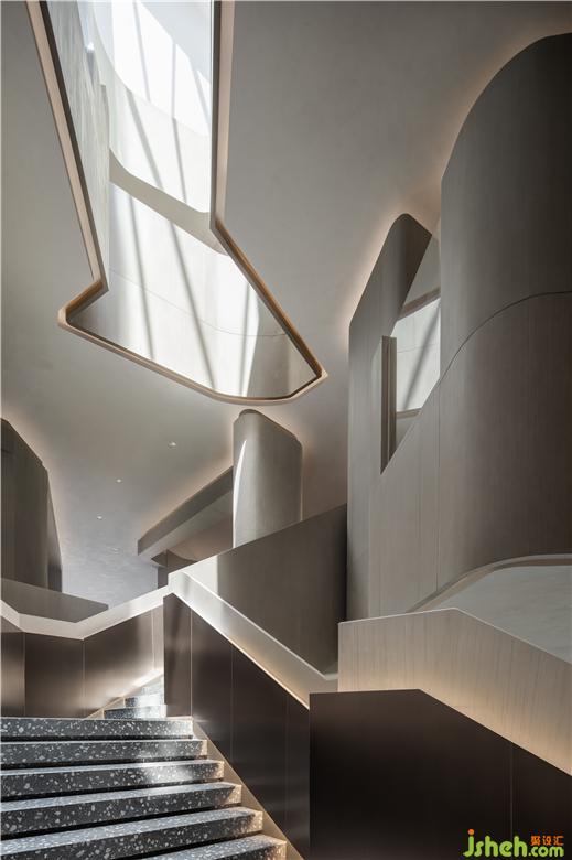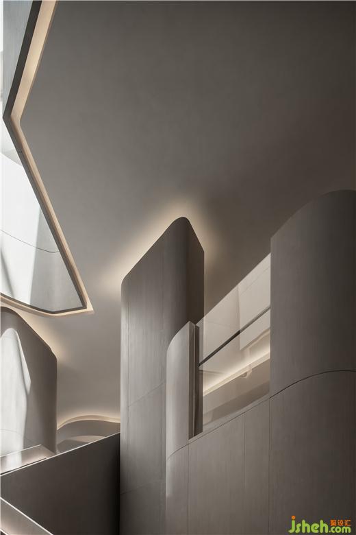 室内设计贯穿了折面与弧线的型态,以体块分明的形式处理,结合局部开槽、叠加、牵引的设计手法,让建筑体态在空间中自然的伸展。在整体的空间基调上,光照而折射的建筑块体跟随着折面的线条进行延展,同时营造出具有现代极简和未来消隐的不同感受,形容为「城市山谷的」气场,未来…幽静深远。峡谷间应型而就溪流以及峡谷间翻流冲突的烟霞风云仿佛要挣脱峡谷型体界定的桎梏,思考呈现冷静、舒适的空间感受,视觉效果上大方,相互结合营造出属于建筑的生命力与深度。
