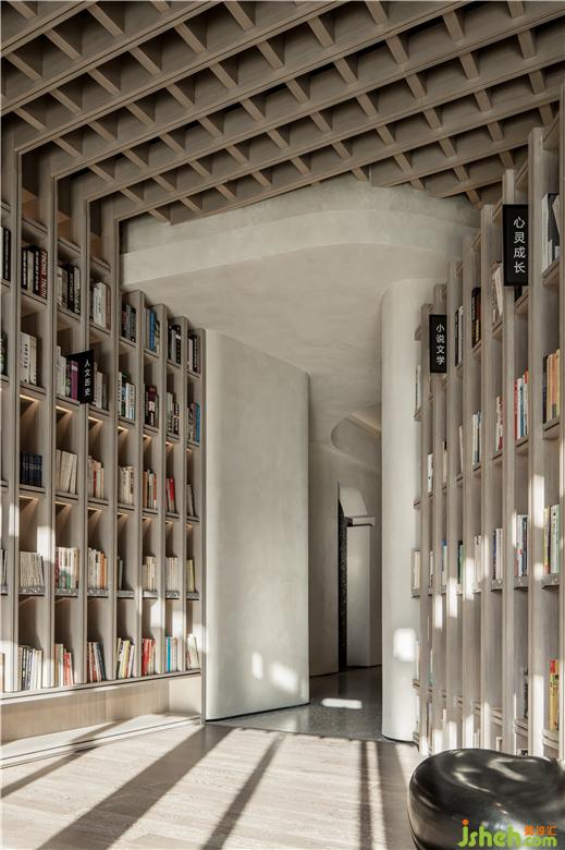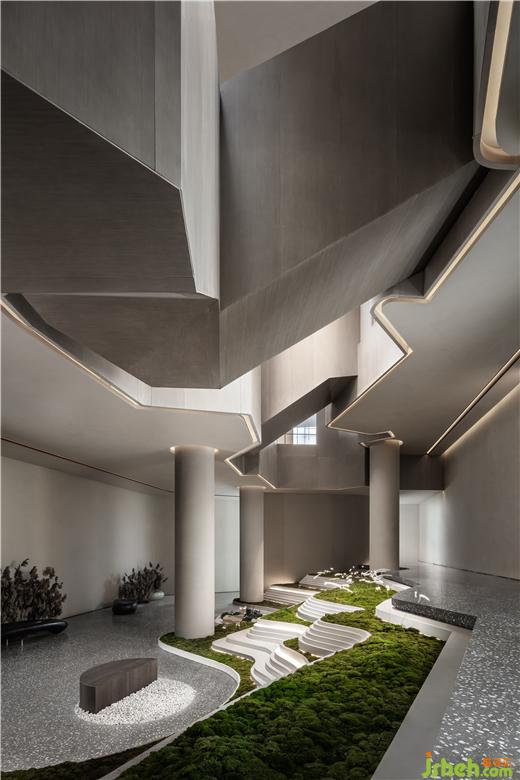 售楼处设计师在中空区域运用通过仿生学设计的抽象提纯,抽离峡谷中的溪流和脉络,让光影交错的丰富变化将建筑形态内置到邻里中心。